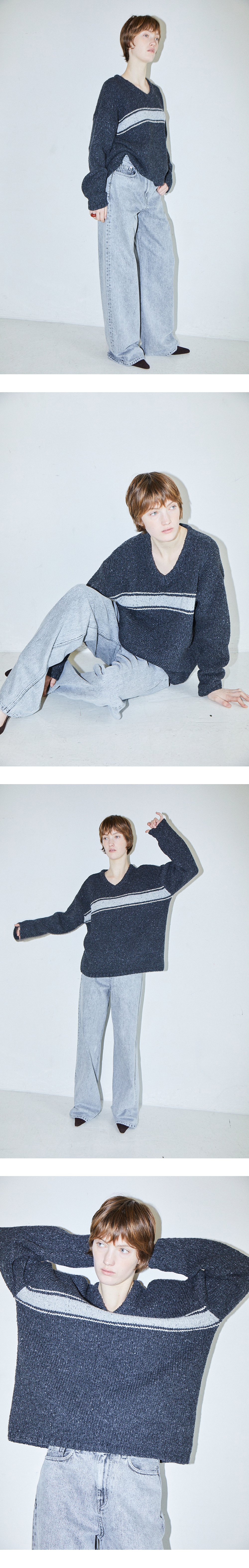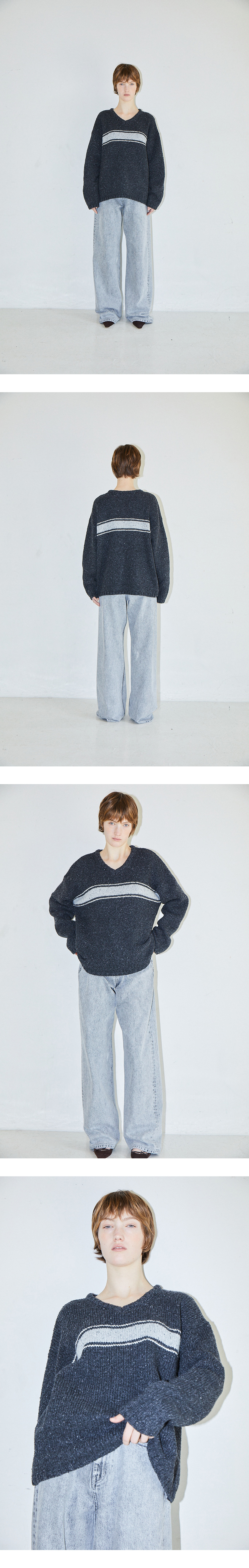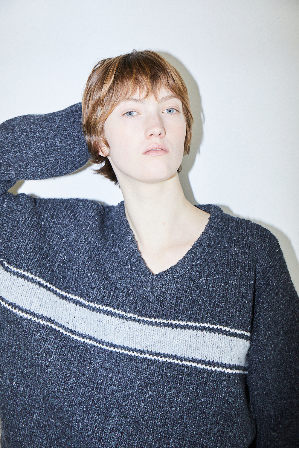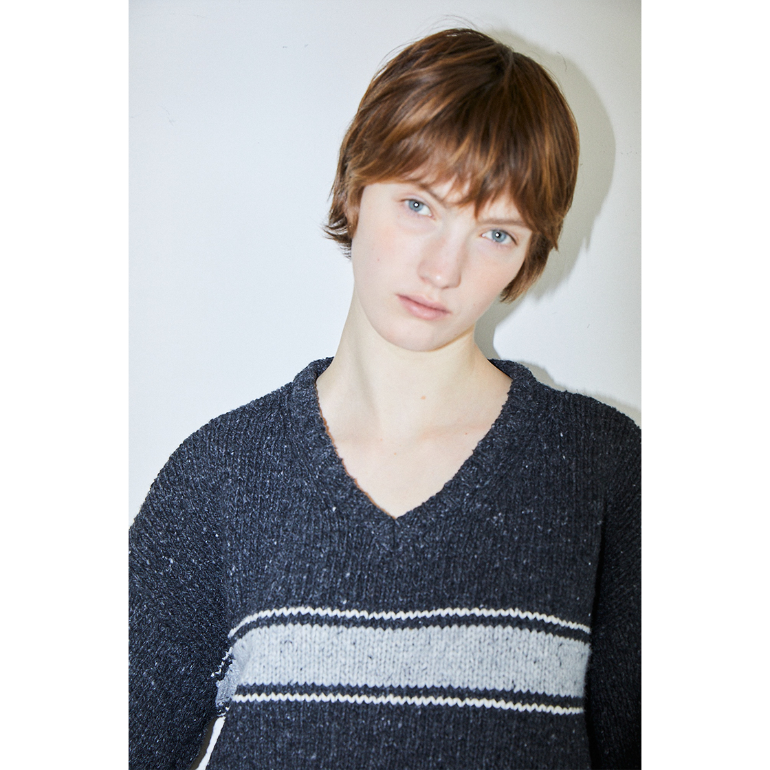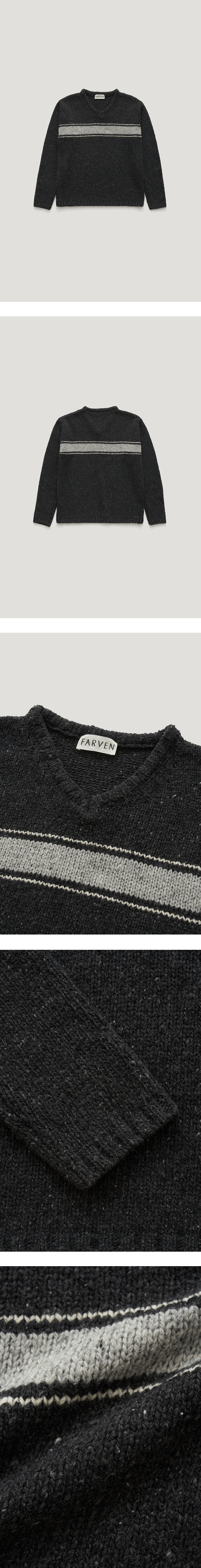 [배송 안내] *해당 상품은 10/4부터 순차적으로 배송되는 상품입니다. 차분한 톤에 포인트로 배색된 스트라이프가 돋보이는 적당한 깊이감의 V 넥 풀오버입니다. 울 혼방 원사로 거친 표면을 표현하기 위해 최소한의 가공으로 양모 원사를 만들었습니다. 이너와 함게 착용하기 좋은 여유로운 실루엣이며 소매와 밑단 그리고 넥 라인의 굵게 짜인 탄탄한 립 조직으로 형태감을 잡아주었습니다.