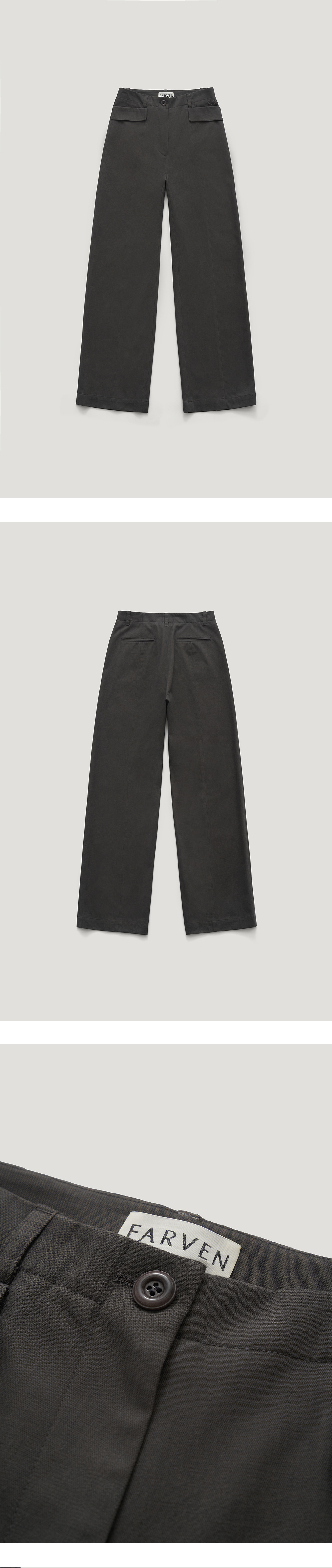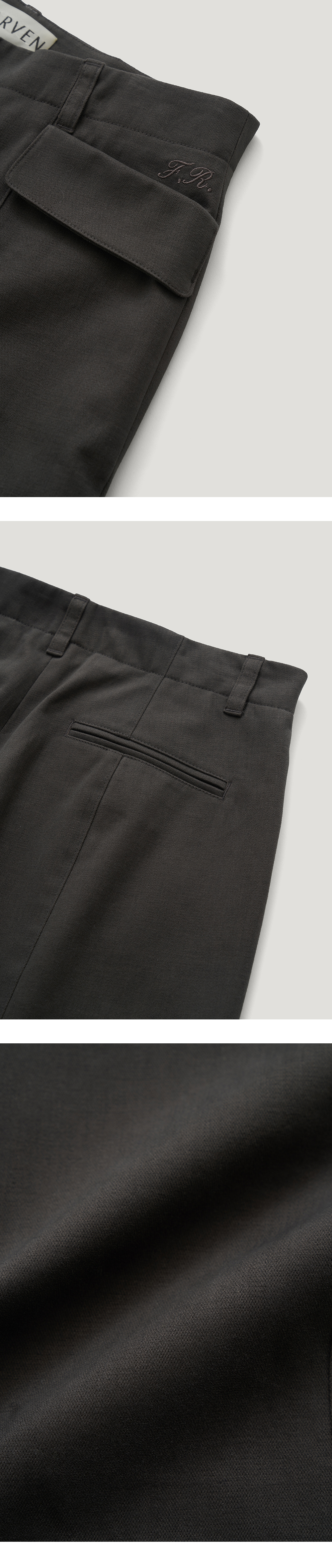 [배송 안내] *해당 상품은 10/4부터 순차적으로 배송되는 상품입니다. 기모기가 올라와 있는 텍스쳐가 돋보이는 스트레이트 핏 핀턱 팬츠입니 다. 앞뒷면에 깔끔하게 잡힌 핀턱 절개 라인과 사선 플랩 포켓 디테일이 포인트이며 밑단 스티치 간격을 넓게 해 전체적인 밸런스를 맞춰주었습 니다. 같은 컬러감의 로고 각인된 너트 단추와 YKK 니켈 지퍼를 사용했 으며 플랩 포켓 위 파르벵 로고 자수 디테일로 포인트를 주어 마무리 했 습니다