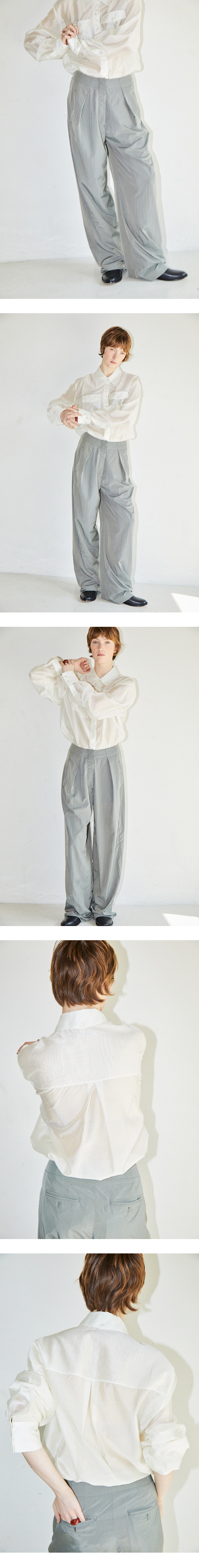 [배송 안내] *해당 상품은 10/4부터 순차적으로 배송되는 상품입니다. 나일론 소재의 가벼운 텍스처가 매력적인 팬츠입니다. 원단 자체에 자연스러운 주름이 있어 착용 시 구김 신경이 덜 가며 앞면에 깊은 핀턱으로 편안함과 스타 일을 동시에 가진 디자인입니다. 여유 있는 실루엣과 자연스럽게 흐르는 광택감 이 어우러져 다양한 상의와 스타일링하기 좋으며, WALTER DOUBLE JACKET과 셋업으로 착용 가능합니다. YKK 지퍼와 로고 각인이 된 단추를 사용하였고 뒤 포켓 삼각 호시 스티치로 견고하게 마무리하였습니다.