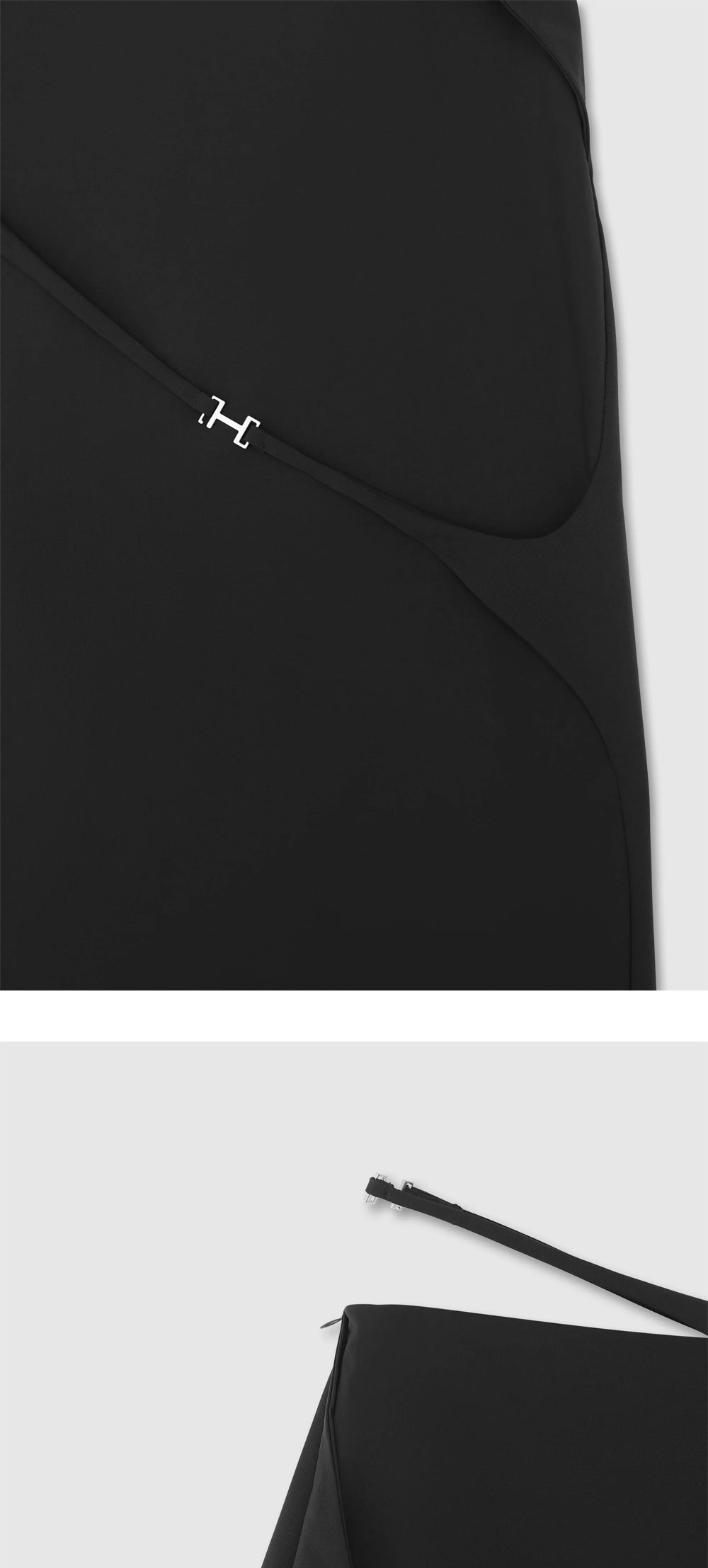 웨이스트밴드와 뒷판 슬릿 디테일이 돋보이는 엘리엇 에밀의 스트랩 테크니컬 스커트 입니다. - 슬림핏 테크니컬 롱스커트 - 금속 H후크가 달린 웨이스트 밴드 디테일