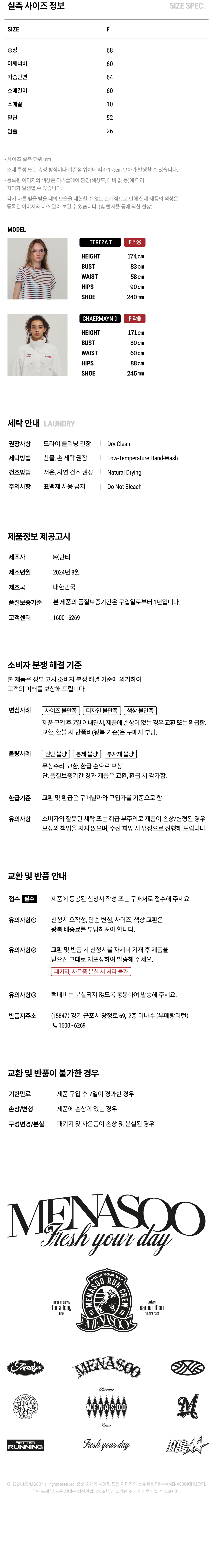 <24 F/W> MENASOO' 2024 Fall Collection. - 이용하시는 기기의 디스플레이마다 색 재현율이 다르므로, 등록된 이미지와 실물 간 색상 차이가 커 보일 수 있습니다. - 상품 단독 촬영 이미지가 비교적 실물과 유사하오나, 실제로 인식되는 색상은 주변 환경 및 광량에 따라 크게 달라 보일 수 있습니다.