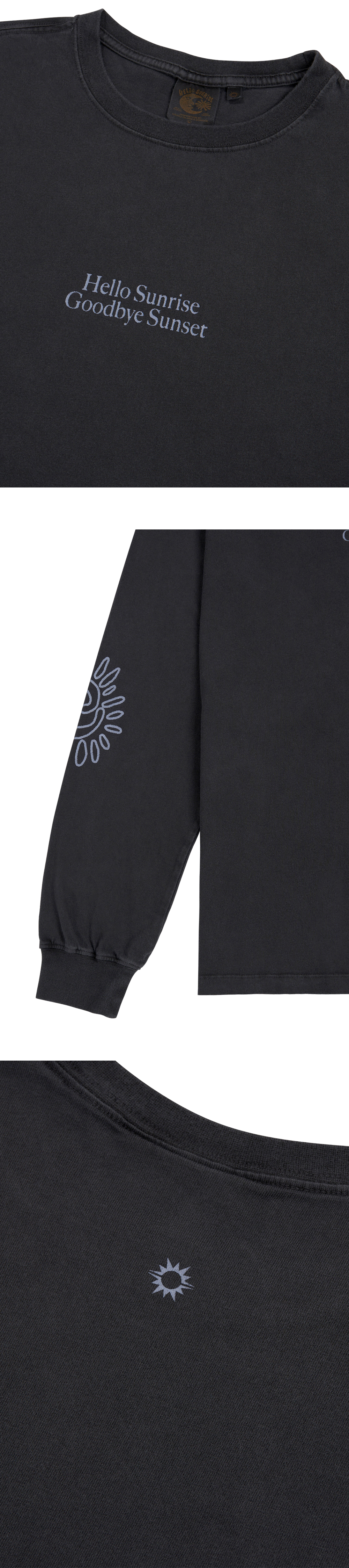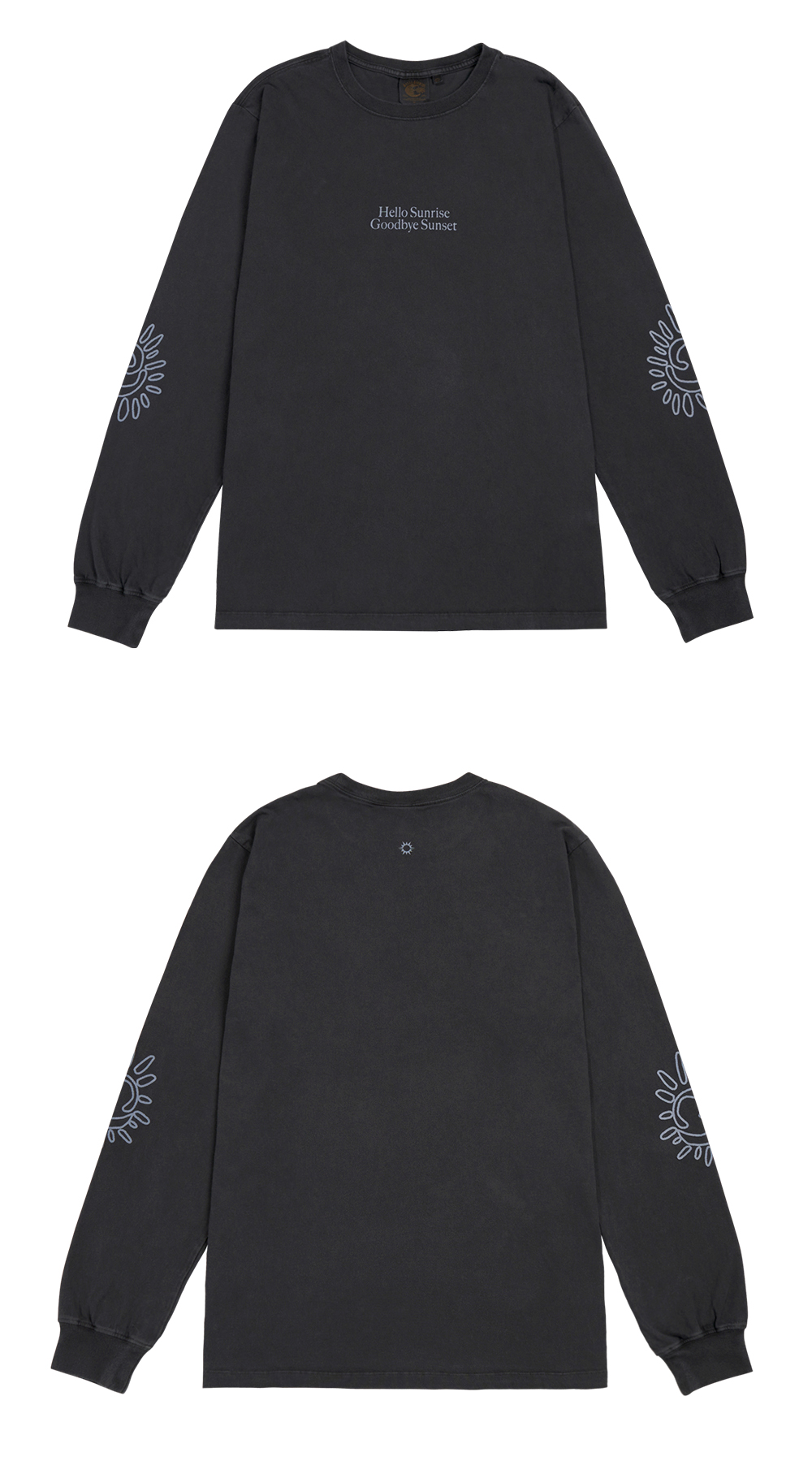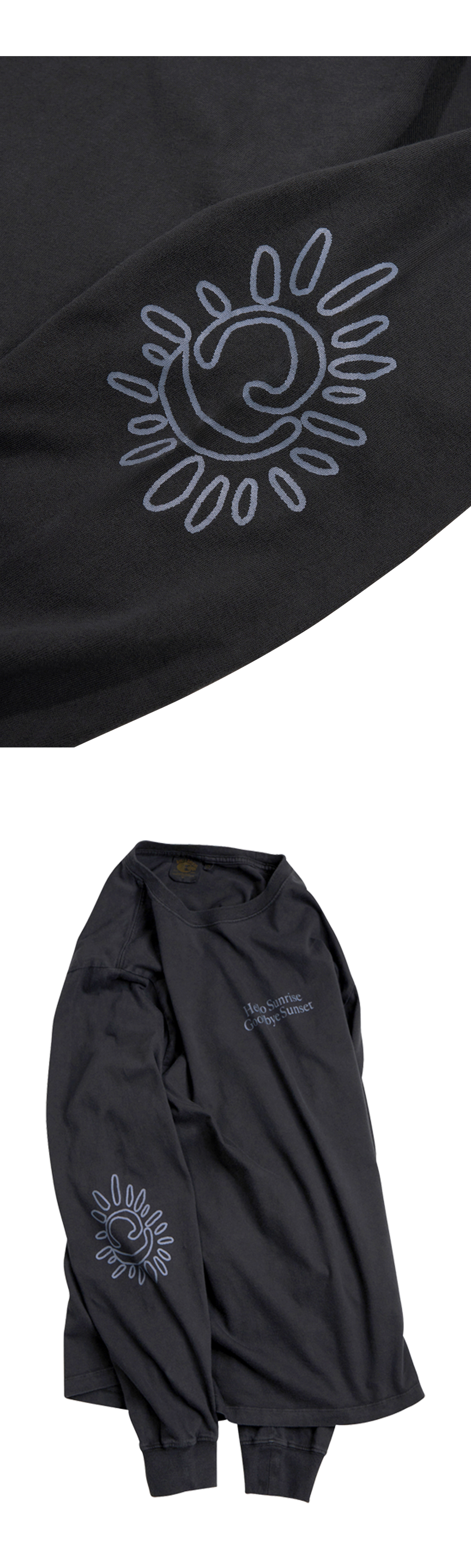 Hello Sunrise x Hank Grüner 스탠다드 핏의 남녀 공용의 긴팔 티셔츠입니다. - 전면 Hello Sunrise x Hank Grüner 헬로 선라이즈 굿바이 선셋 타이포 그래픽 - 소매 Hello Sunrise x Hank Grüner 태양 그래픽 - 후면 헬로 선라이즈 심볼 자수 - 피그먼트 다잉 기법 - 어깨 보강 체인스티치 진행으로 높은 내구성 - 부드러운 원단의 터치감 * Shell : Cotton 100% * Made in Korea