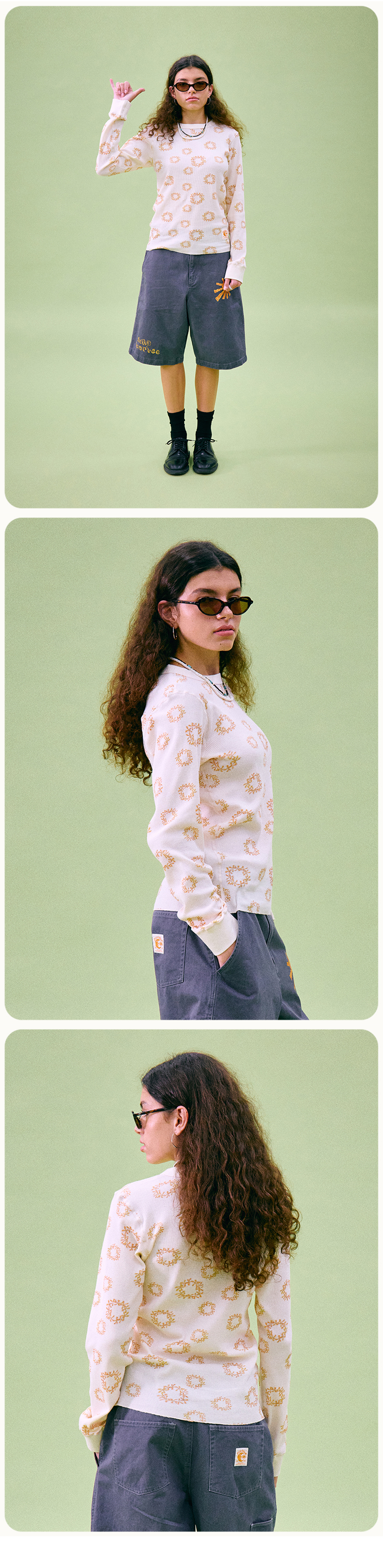 Hello Sunrise x Hank Grüner 피티드 핏의 여성용 긴팔 티셔츠입니다. - 전면 Hello Sunrise x Hank Grüner 월계수 패턴 그래픽 - 전면 Hello Sunrise x Hank Grüner 포인트 라벨 - 전체 봉제 오드람프 진행으로 높은 내구성 - 부드러운 원단의 터치감과 좋은 신축성 * Shell : Cotton 95%, Span 5% * Made in Korea