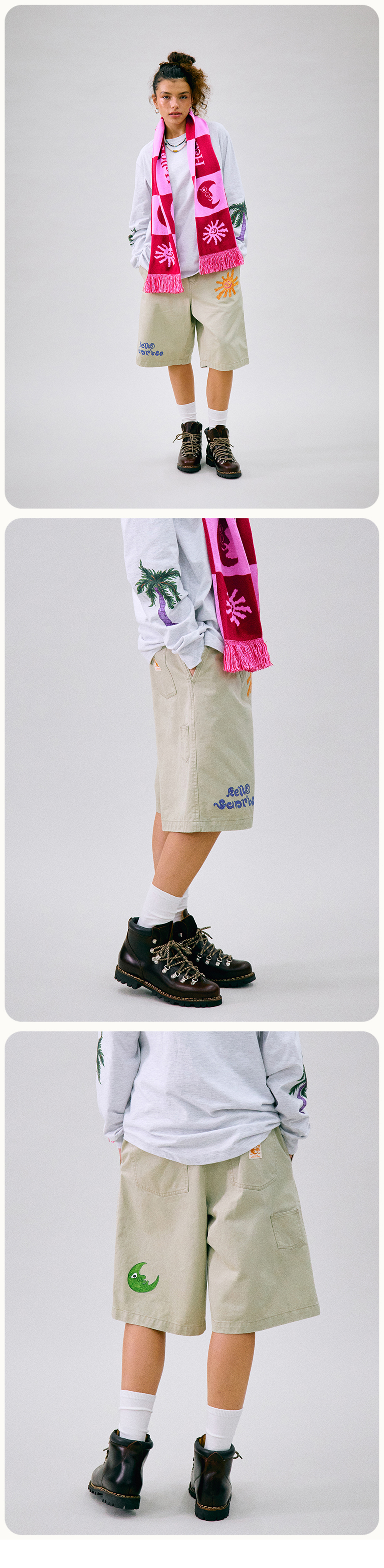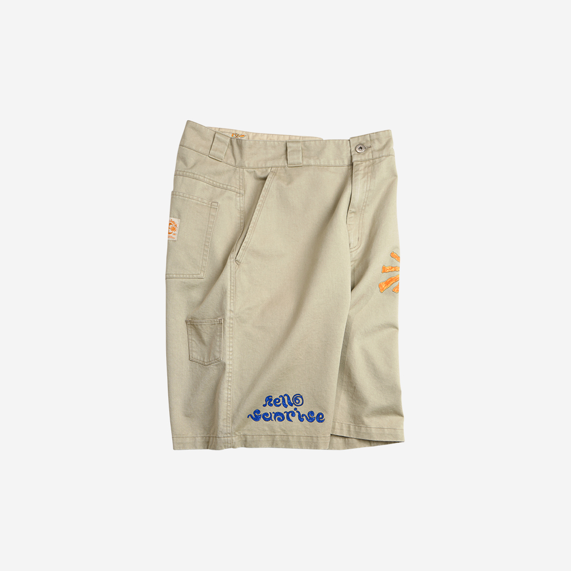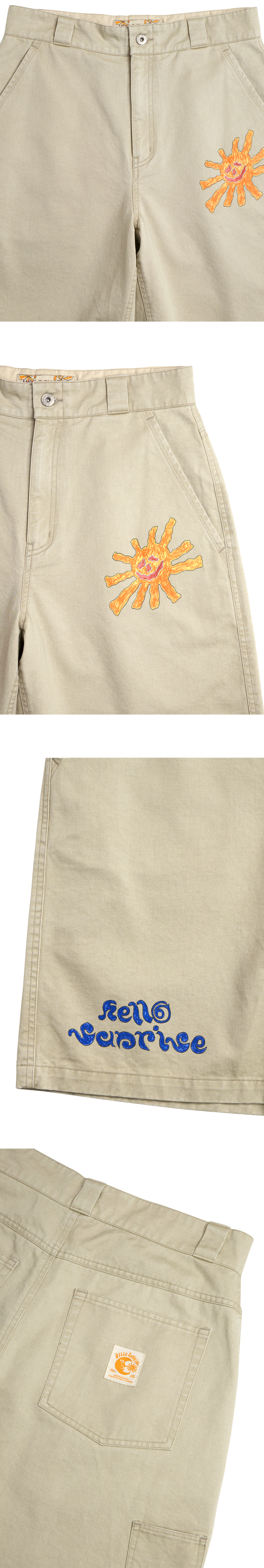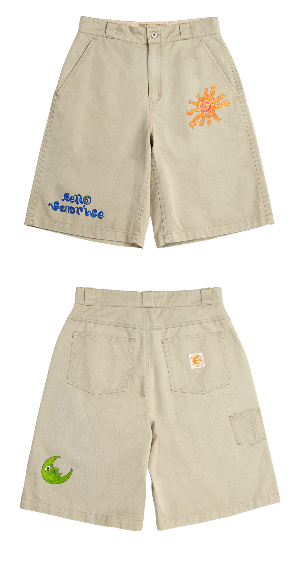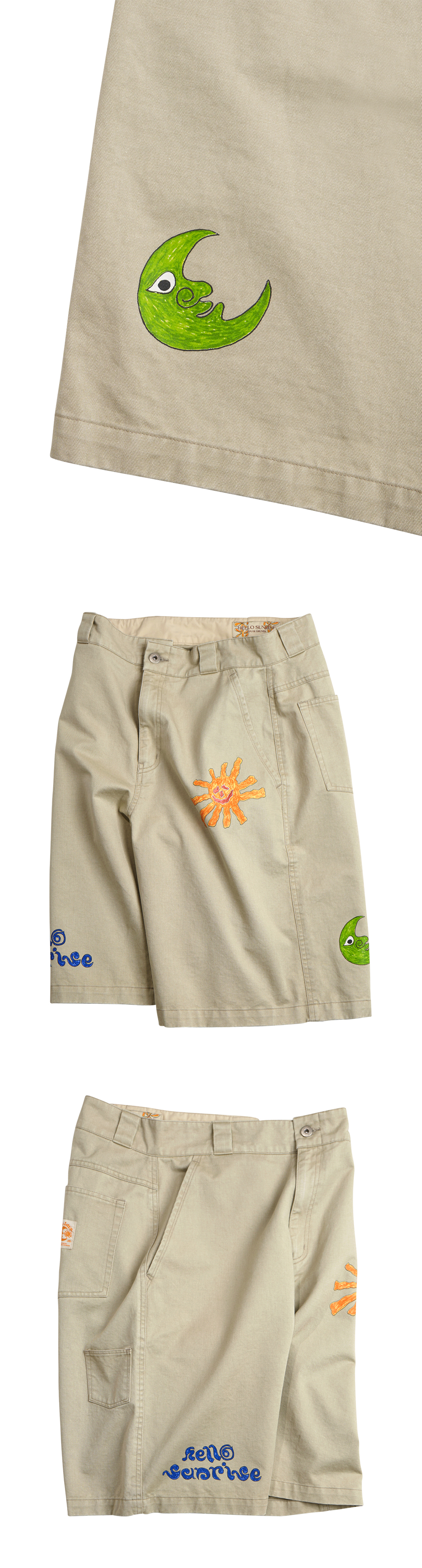 Hello Sunrise x Hank Grüner 레귤러 핏, 중간 기장의 남녀 공용의 버뮤다 팬츠입니다. - 전면 Hello Sunrise x Hank Grüner 태양 그래픽, 헬로 선라이즈 두들 로고 그래픽 - 후면 Hello Sunrise x Hank Grüner 달 그래픽 - 후면 포인트 미니 포켓 디테일 - 후면 포켓의 포인트 라벨 디테일 - 워싱 가공으로 빈티지한 무드 * Shell : Cotton 100% * Made in Korea