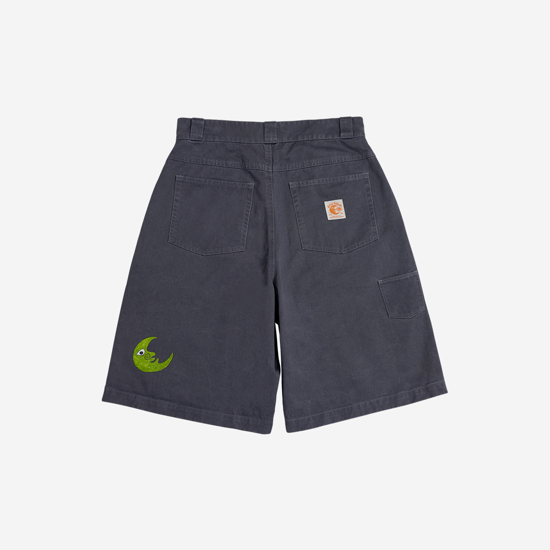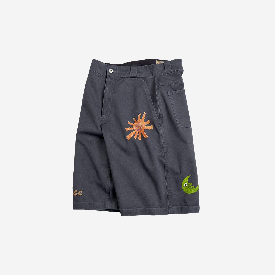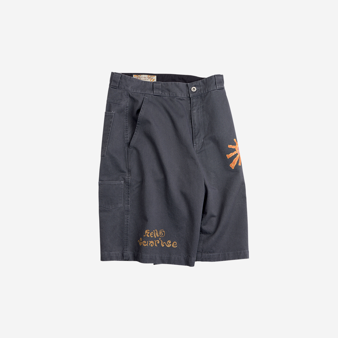 Hello Sunrise x Hank Grüner 레귤러 핏, 중간 기장의 남녀 공용의 버뮤다 팬츠입니다. - 전면 Hello Sunrise x Hank Grüner 태양 그래픽, 헬로 선라이즈 두들 로고 그래픽 - 후면 Hello Sunrise x Hank Grüner 달 그래픽 - 후면 포인트 미니 포켓 디테일 - 후면 포켓의 포인트 라벨 디테일 - 워싱 가공으로 빈티지한 무드 * Shell : Cotton 100% * Made in Korea