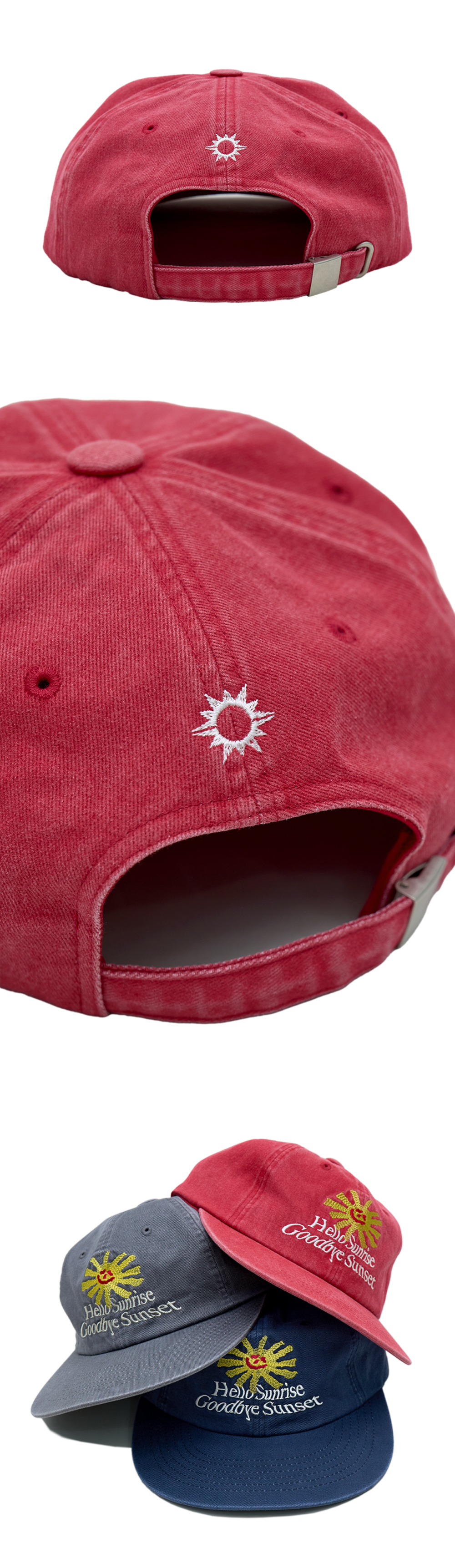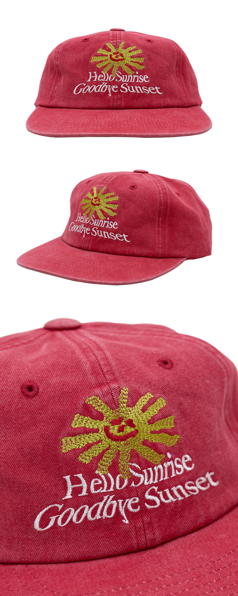 Hello Sunrise x Hank Grüner 그래픽이 자수로 들어간 6패널 캡입니다. - Relaxed Fit의 여유로운 착용감 - 기존핏보다 1cm 더 높아진 17.5cm로 깊이감이 있는 착용감 - 전면 Hello Sunrise x Hank Grüner 태양, 타이포 로고 자수 - 뒤판 Hello Sunrise 심볼 자수 처리 * 모자의 챙을 개인적인 취향에 따라 원하시는 각도로 구부려 착용하시길 권장 드립니다. * 모자의 챙이 워싱과정으로 살짝 삐뚤어져보이는 현상은 제품의 불량이 아니므로 반품사유가 되지 않습니다. * Cotton 100% * Made in Korea