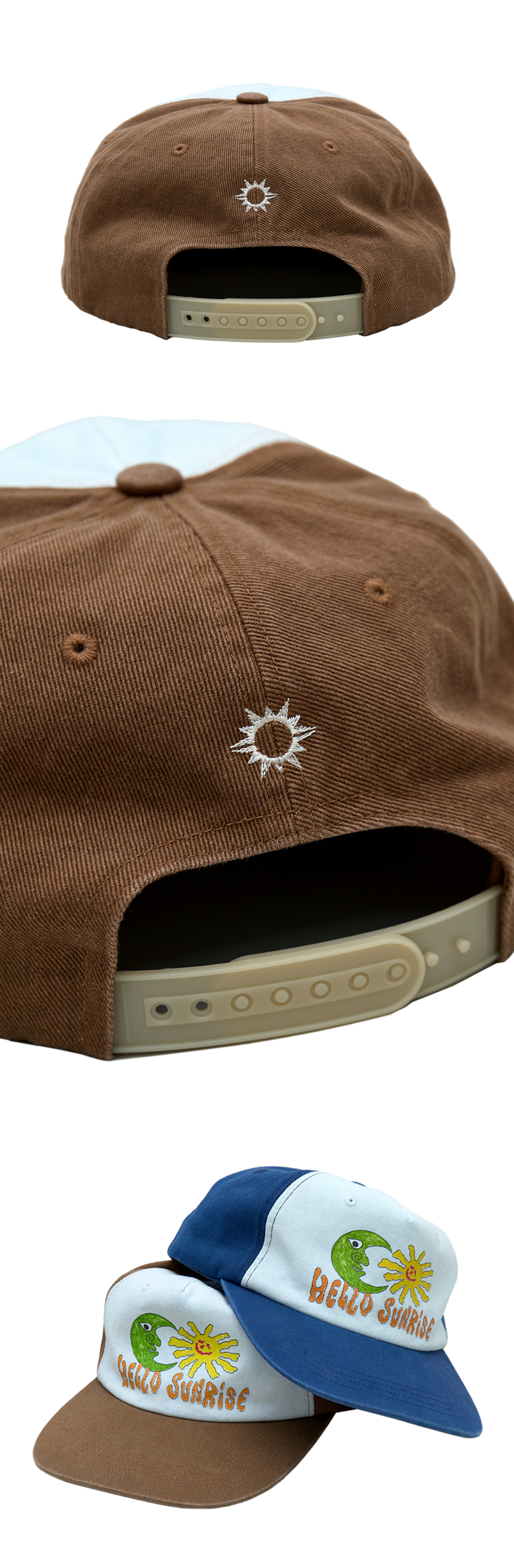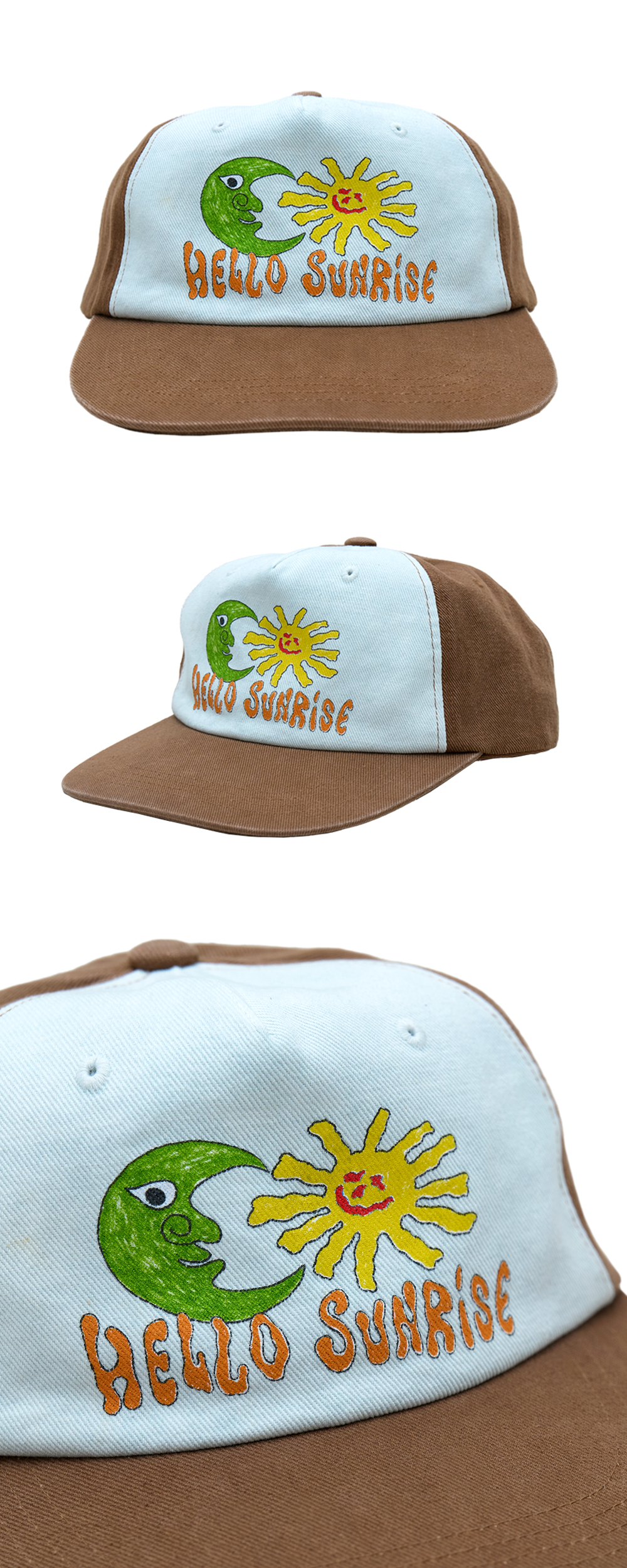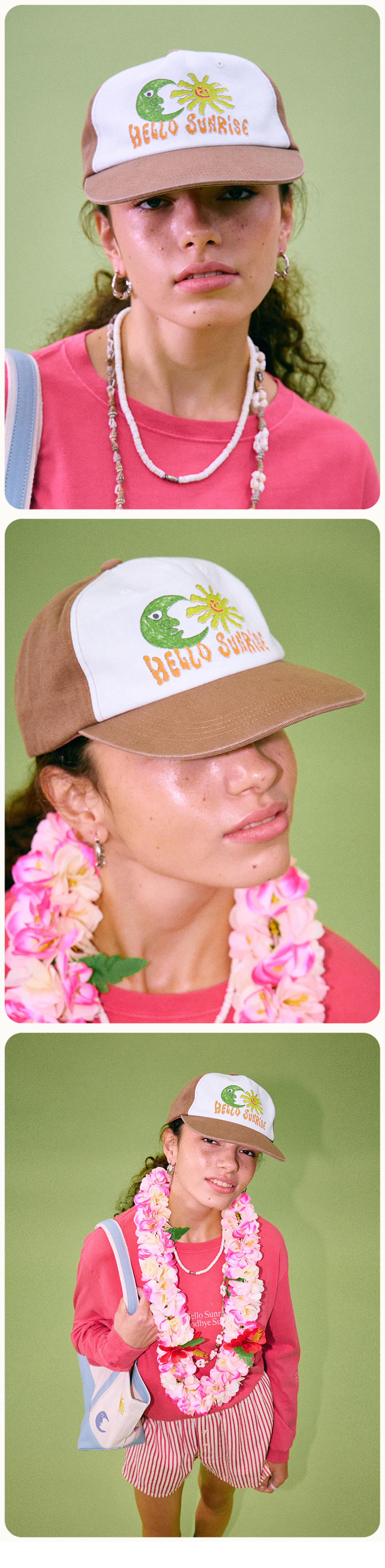 Hello Sunrise x Hank Grüner 그래픽이 들어간 5패널 캡입니다. - 전면 배색 패널 - 전면 Hello Sunrise x Hank Grüner 두들 그래픽 나염 - 뒤판 Hello Sunrise 심볼 자수 처리 * 모자의 챙을 개인적인 취향에 따라 원하시는 각도로 구부려 착용하시길 권장 드립니다. * 모자의 챙이 워싱과정으로 살짝 삐뚤어져보이는 현상은 제품의 불량이 아니므로 반품사유가 되지 않습니다. * Cotton 100% * Made in Korea