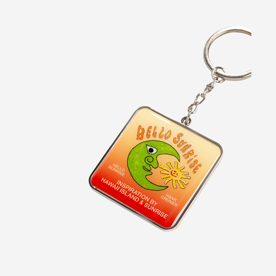 Hello Sunrise x Hank Grüner 그래픽 들어간 키링입니다. - 전면 Hello Sunrise x Hank Grüner 그래픽 에폭시 마감 - 평링으로 다양한 키링 결합 가능 - 후면 금속 Hello Sunrise 로고 및 타이포 레이져 각인 * Metal 100% * Made in Korea