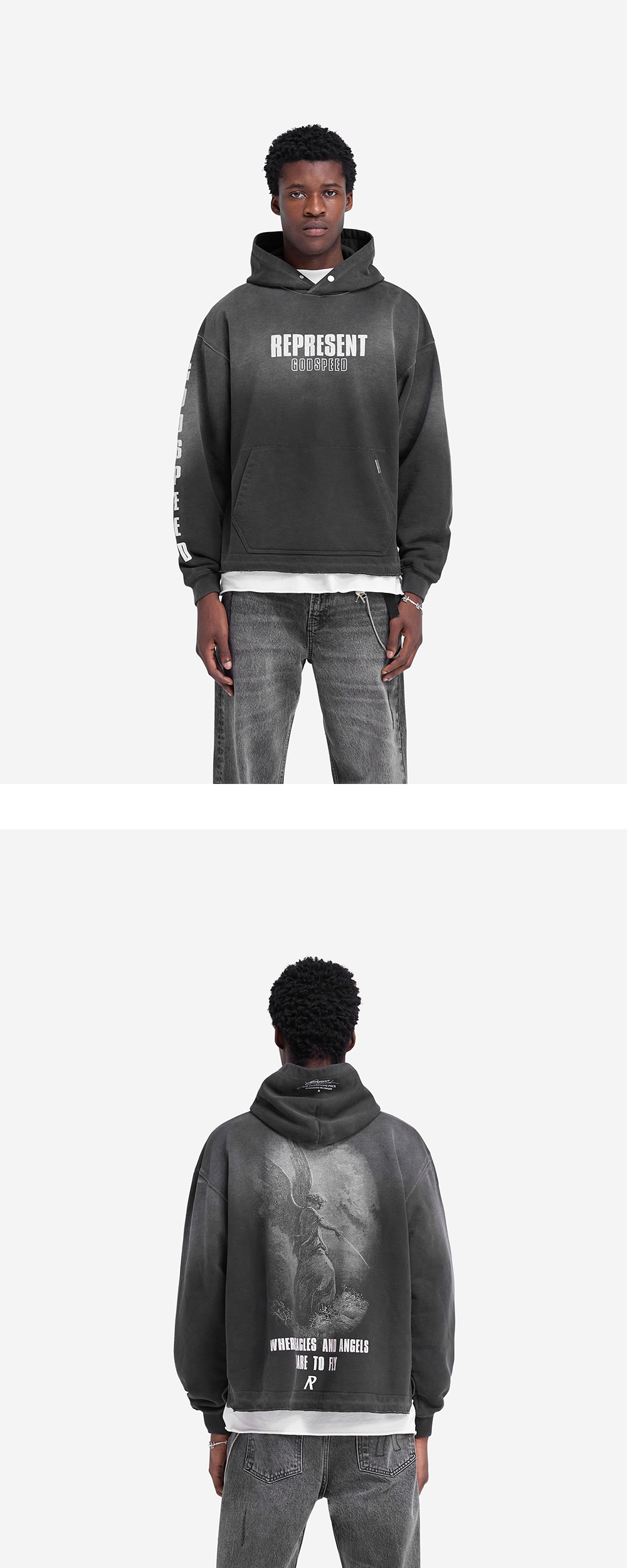 색이 바랜 듯한 워싱과 프린팅의 크랙으로 빈티지한 무드를 연출할 수 있는 리프레젠트의 후디입니다. - 오버사이즈 핏 - 페이드 아웃 워싱 - 러프한 밑단 마감 - 전/후면 및 소매 그래픽 크랙 프린팅 - 전면 포켓 금속 로고 막대 디테일 - 후드 스냅 버튼 디테일