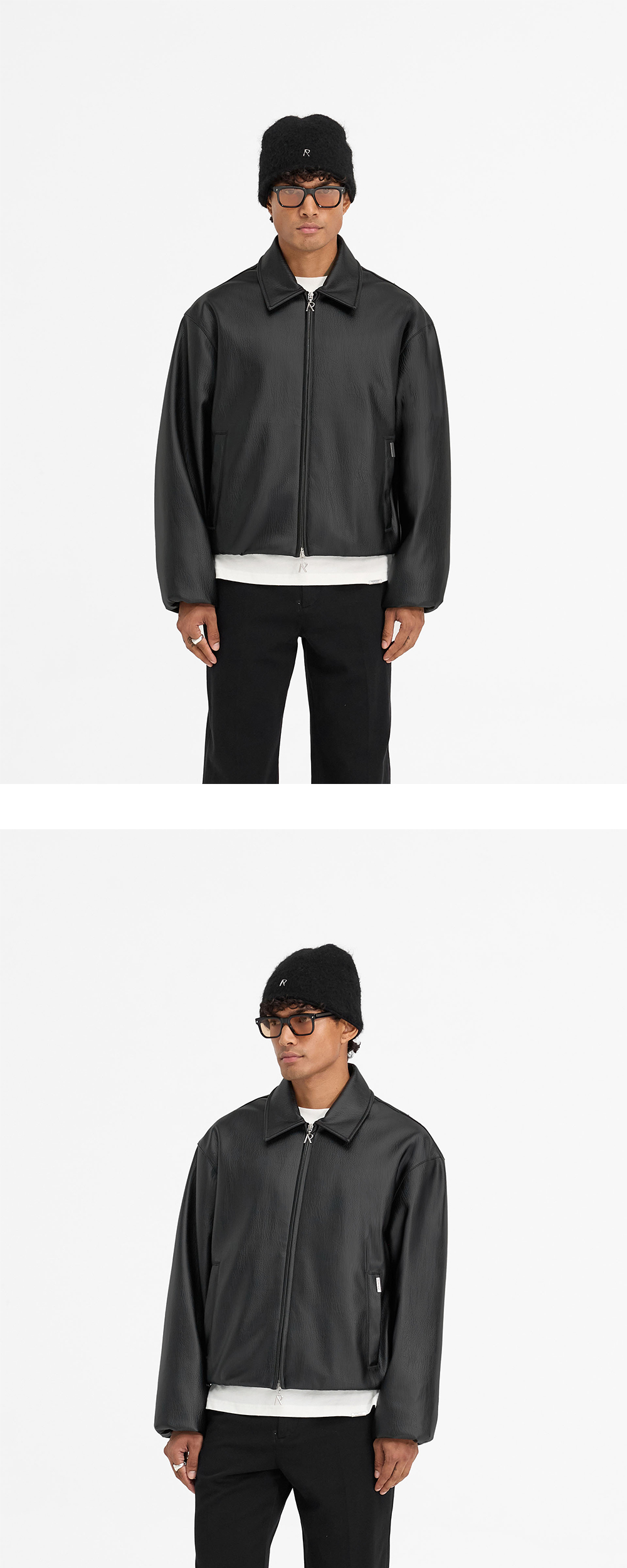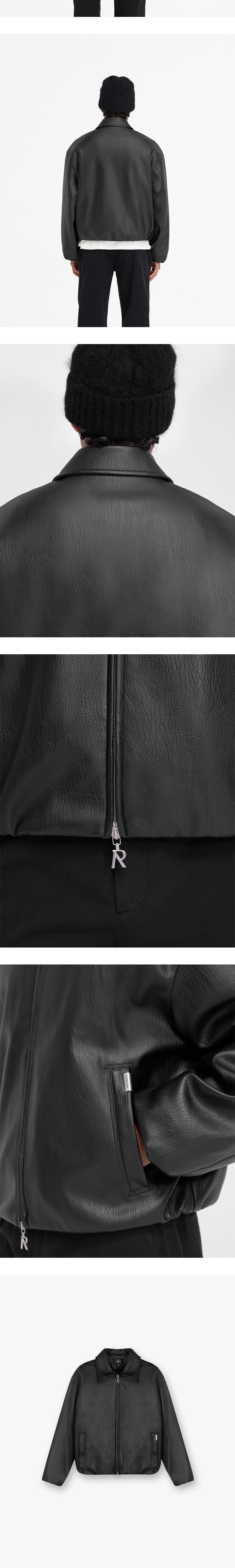 리프레젠트의 레더 봄버 자켓입니다. - 인조 가죽 소재 - 내부에 적용된 비스코스 안감 - 전면 투웨이 지퍼 클로징 - 지퍼 헤드에 적용된 로고 팬던트 - 좌측 포켓 금속 로고 막대 디테일