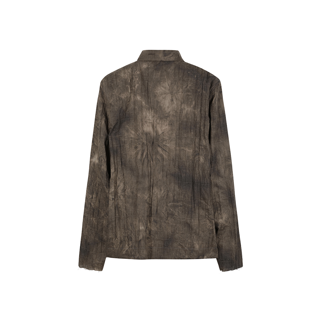 수작업으로 진행된 염색으로 인한 컬러와 패턴이 매력적인 치아헝 수의 자켓입니다. - 수작업으로 진행된 염색 - 전체적으로 적용된 불규칙적인 가로 스티치 디테일 - 러프한 마감 - 1940년대 동전을 빈티지 처리하여 제작한 전면 버튼