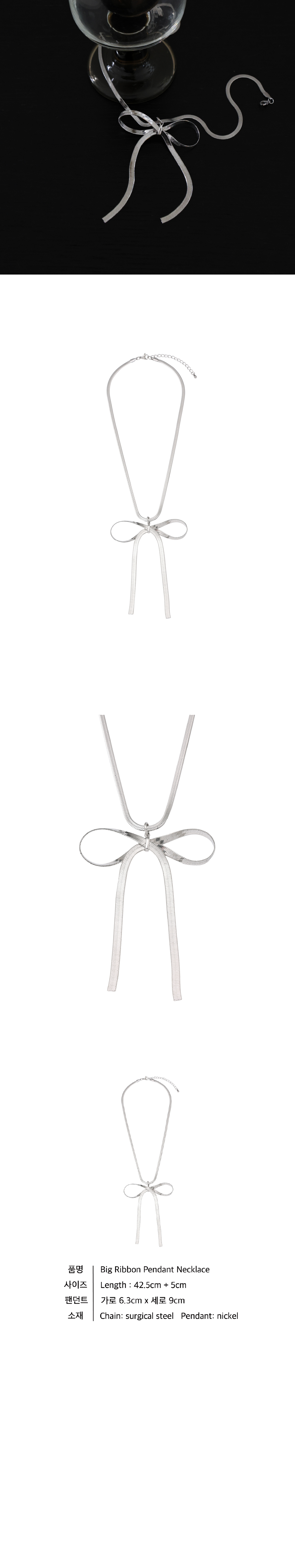 볼드한 리본 팬던트가 포인트인 네크리스 입니다. Chain : surgical steel Pendant : Nickel 5cm 조절 체인을 더해 길이 조절이 가능하게 제작되었습니다.