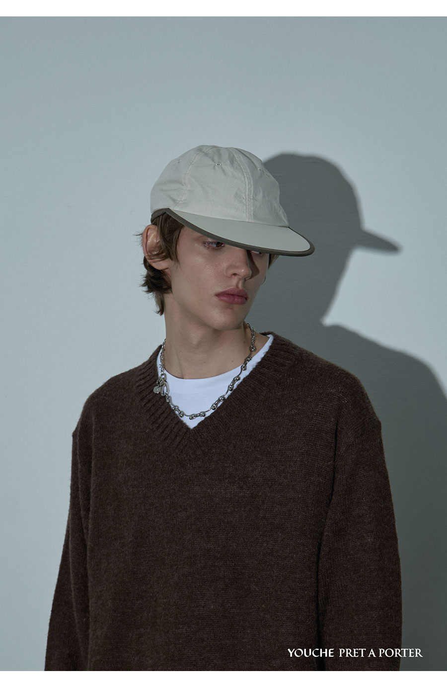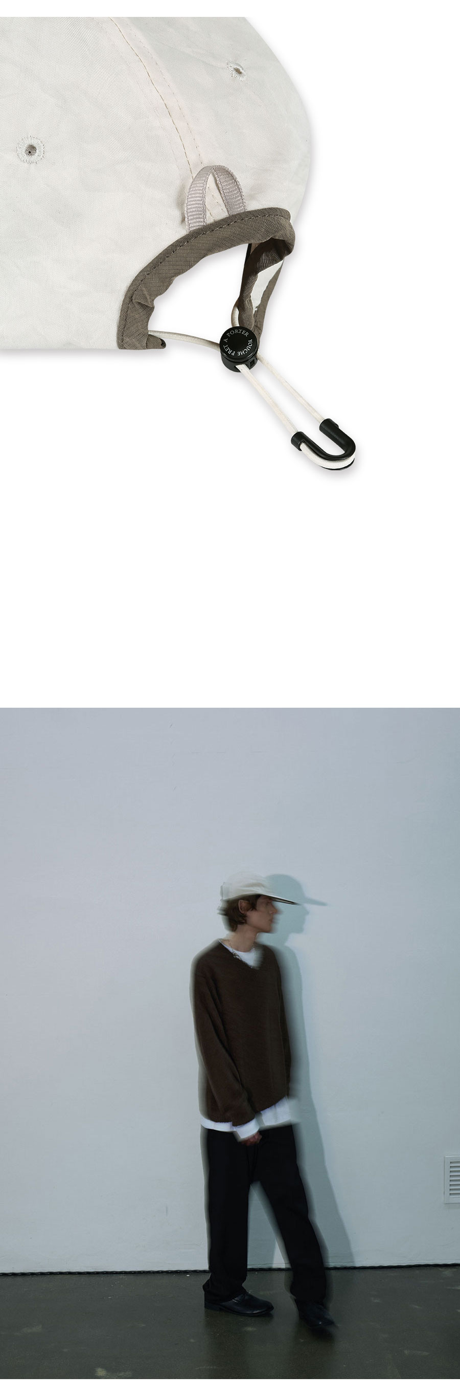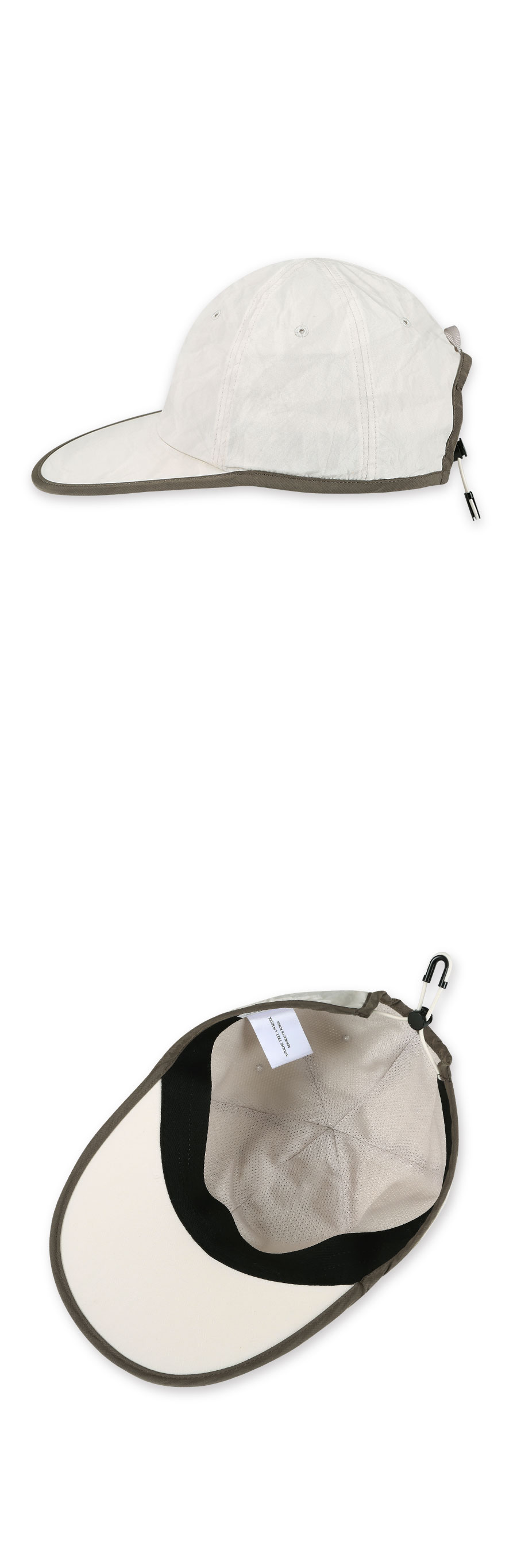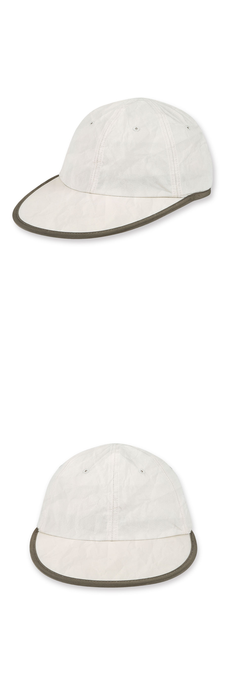 Material Outshell 1 : Cotton 65% Nylon 35% Outshell 2 : Nylon 60% Polyester 40% Lining : Polyester 100% Colour : Ivory - 180g/sqm Creased processing fabric - Six panel cap - Long and wide brim - Adjustable logo stopper - Contrast piping point - Coolmax liner band - Mesh lining - 주름 가공 포인트의 식스 패널 캡