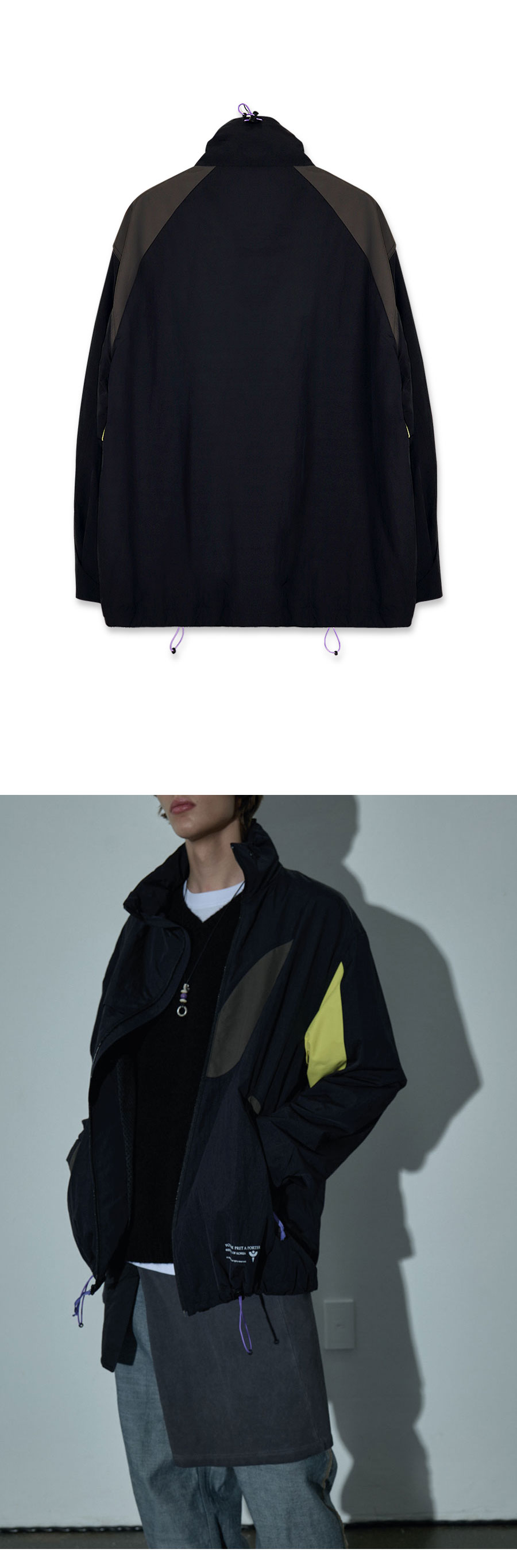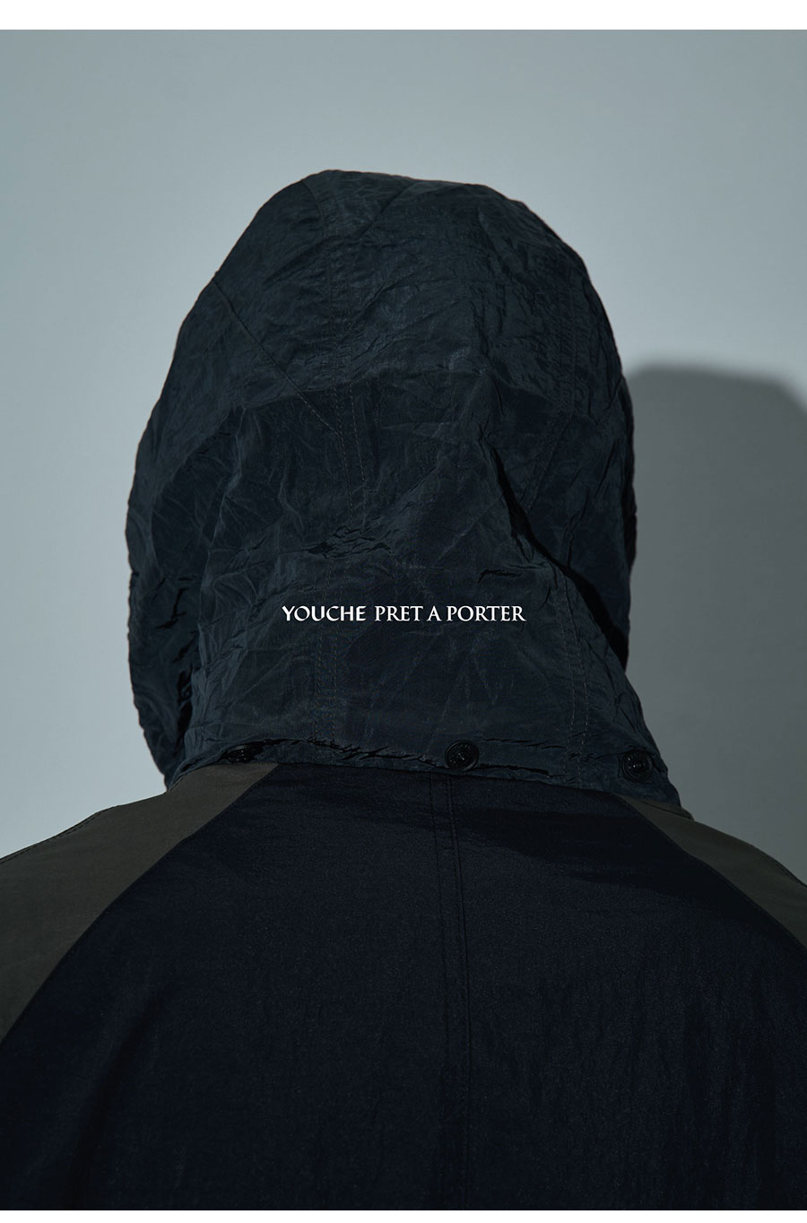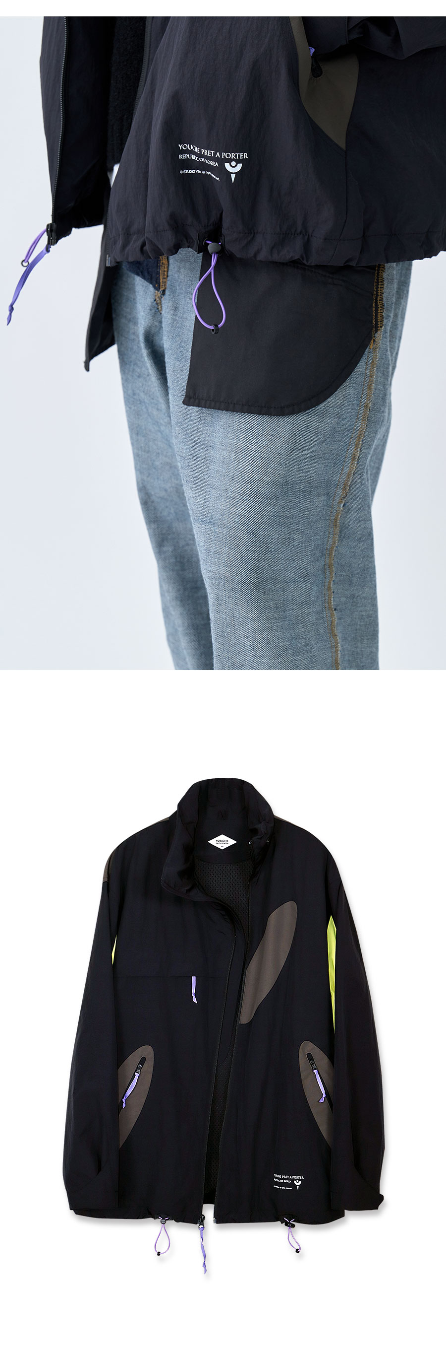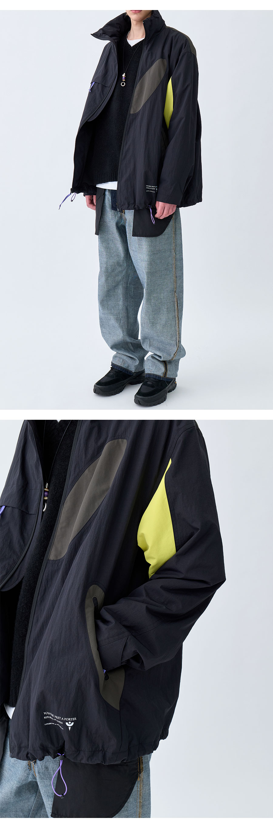 Material Outshell 1 : Nylon 100% (Water Repellent Processed) Outshell 2 : Nylon 100% Outshell 3 (Hoodie) : Recycled Nylon 100% (WR) Lining : Polyester 100% Colour : Black - Water Repellent processed nylon fabirc - Aero Washed processed - 121g/sqm nylon 100% ( Backside : Polyurethane coated ) - Oval point pocket detail - Curved front zipper detail YKK社 - 카라 내부의 컴포터블 후드