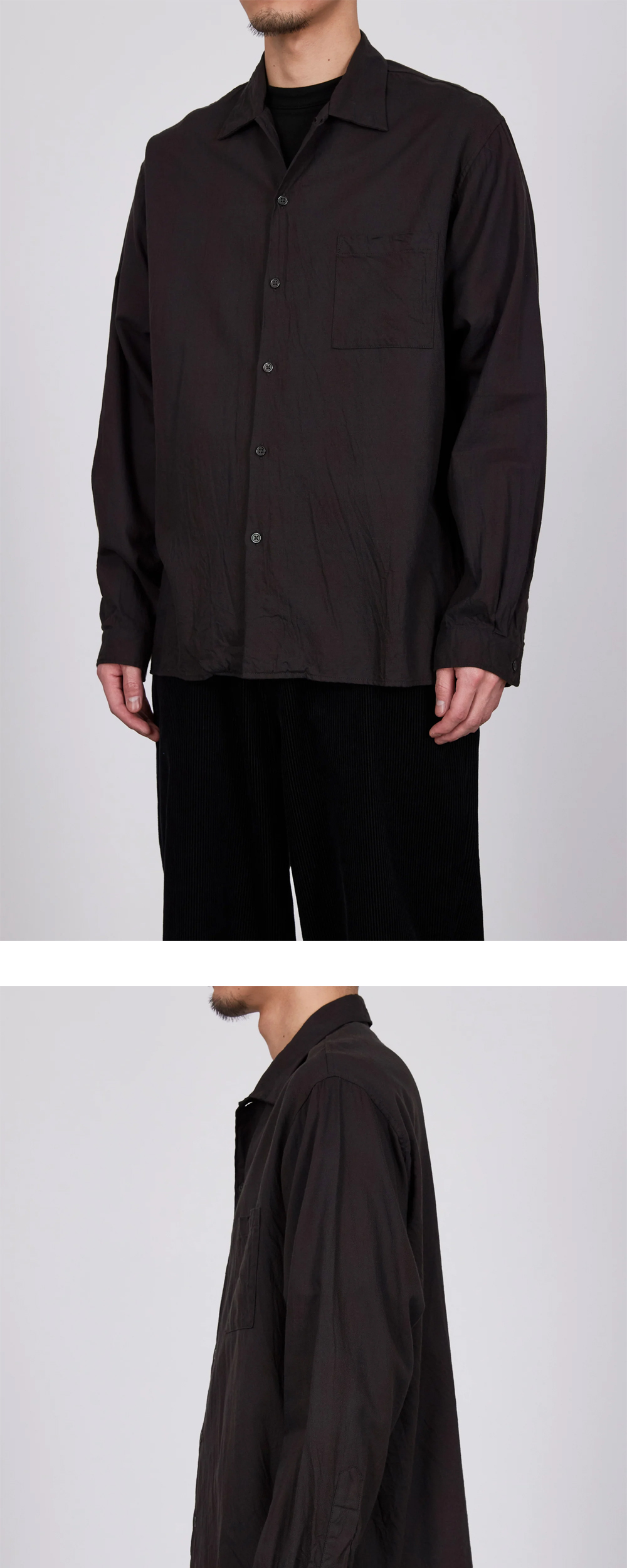 은은한 체크 패턴이 매력적인 마카의 오픈 칼라 셔츠입니다. - 과하지 않게 열린 칼라 디자인 - 여유 있고 편안한 착용감 - 첫 번째 버튼까지 체결하면 레귤러 칼라 셔츠로 착용 가능