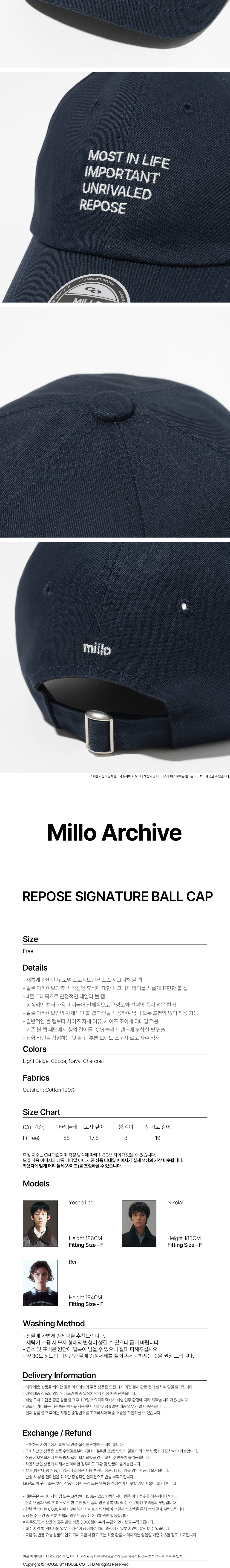 - 새롭게 준비한 뉴 노멀 프로젝트인 리포즈 시그니처 볼 캡 - 밀로 아카이브의 첫 시작점인 휴식에 대한 시그니처 의미를 새롭게 표현한 볼 캡 - 4줄 그래픽으로 안정적인 데일리 볼 캡 - 상징적인 컬러 사용과 더불어 전체적으로 구성도와 선택의 폭이 넓은 컬러 - 밀로 아카이브만의 자체적인 볼 캡 패턴을 적용하여 남녀 모두 불편함 없이 착용 가능 - 일반적인 볼 캡보다 사이즈 자체 여유, 사이즈 조이개 디테일 적용 - 기존 볼 캡 패턴에서 챙의 길이를 1CM 늘려 트렌드에 부합한 핏 연출 - 잡화 라인을 상징하는 뒷 볼 캡 부분 브랜드 소문자 로고 자수 적용