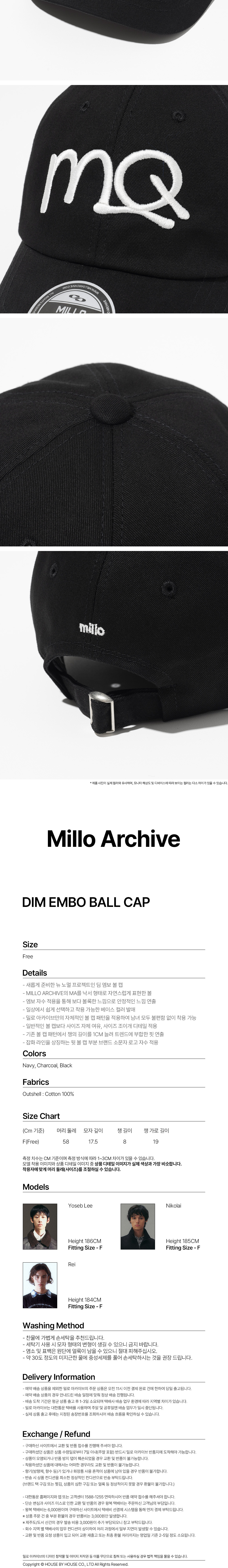 - 새롭게 준비한 뉴 노멀 프로젝트인 딤 엠보 볼 캡 - MILLO ARCHIVE의 MA를 낙서 형태로 자연스럽게 표현한 볼 - 엠보 자수 적용을 통해 보다 볼록한 느낌으로 안정적인 느낌 연출 - 일상에서 쉽게 선택하고 착용 가능한 베이스 컬러 발매 - 밀로 아카이브만의 자체적인 볼 캡 패턴을 적용하여 남녀 모두 불편함 없이 착용 가능 - 일반적인 볼 캡보다 사이즈 자체 여유, 사이즈 조이개 디테일 적용 - 기존 볼 캡 패턴에서 챙의 길이를 1CM 늘려 트렌드에 부합한 핏 연출 - 잡화 라인을 상징하는 뒷 볼 캡 부분 브랜드 소문자 로고 자수 적용
