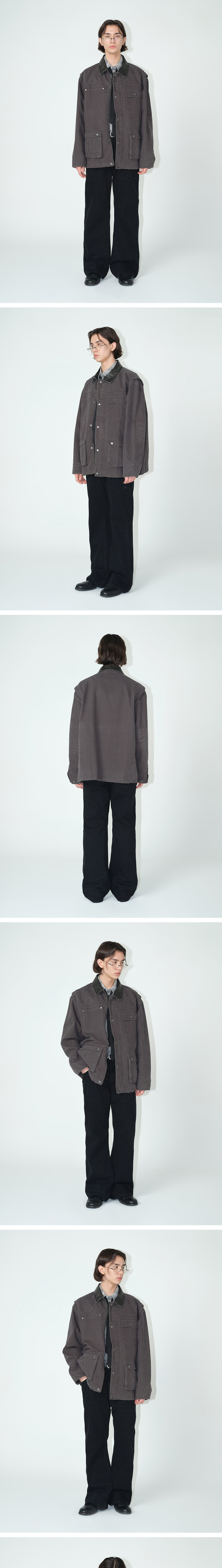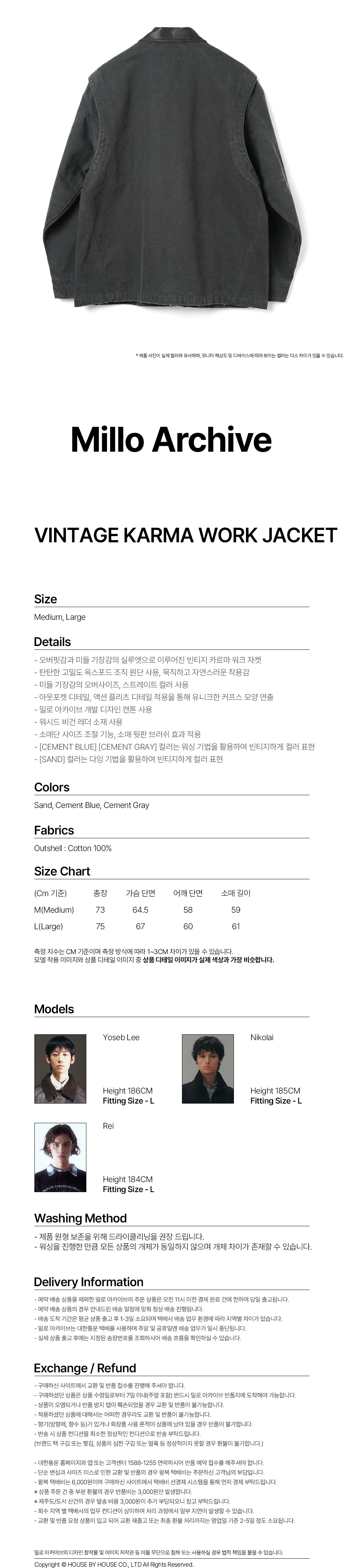 - 오버핏감과 미들 기장감의 실루엣으로 이루어진 빈티지 카르마 워크 자켓 - 탄탄한 고밀도 옥스포드 조직 원단 사용, 묵직하고 자연스러운 착용감 - 미들 기장감의 오버사이즈, 스트레이트 칼라 사용 - 아웃포켓 디테일, 액션 플리츠 디테일 적용과 유니크한 커프스 모양 연출 - 밀로 아카이브 개발 디자인 캔톤 사용 - 워시드 비건 레더 소재 사용 - 소매단 사이즈 조절 기능, 소매 뒷판 브러쉬 효과 적용 - [CEMENT BLUE] [CEMENT GRAY] 컬러는 워싱 기법을 활용하여 빈티지하게 컬러를 표현 - [SAND] 컬러는 다잉 기법을 활용하여 빈티지하게 컬러를 표현
