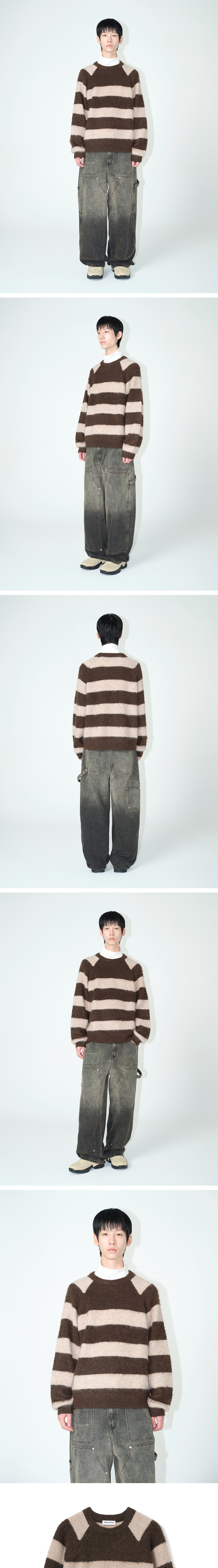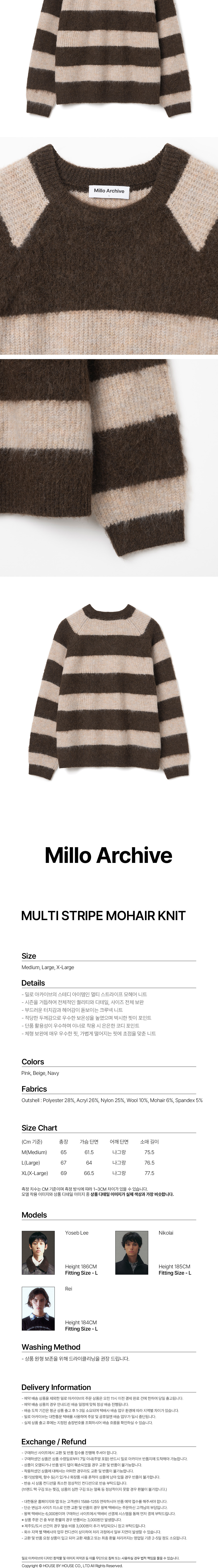 - 밀로 아카이브의 스테디 아이템인 멀티 스트라이프 모헤어 니트 - 시즌을 거듭하여 전체적인 퀄리티와 디테일, 사이즈 전체 보완 - 부드러운 터치감과 헤어감이 돋보이는 크루넥 니트 - 적당한 두께감으로 우수한 보온성을 높였으며 박시한 핏이 포인트 - 단품 활용성이 우수하며 이너로 착용 시 은은한 코디 포인트 - 체형 보완에 매우 우수한 핏, 가볍게 떨어지는 핏에 초점을 맞춘 니트