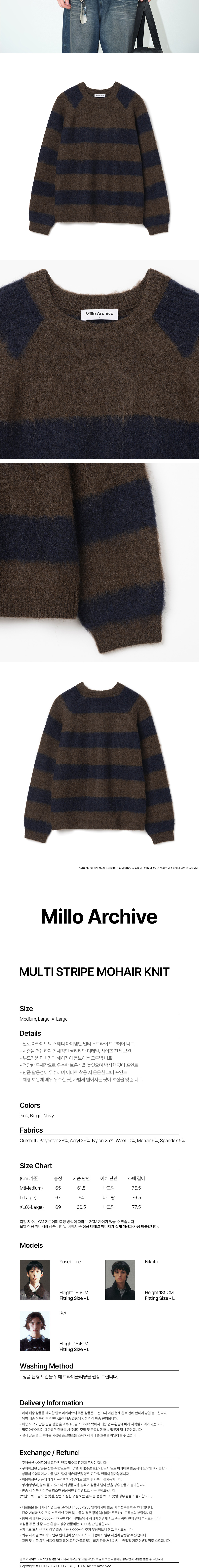 - 밀로 아카이브의 스테디 아이템인 멀티 스트라이프 모헤어 니트 - 시즌을 거듭하여 전체적인 퀄리티와 디테일, 사이즈 전체 보완 - 부드러운 터치감과 헤어감이 돋보이는 크루넥 니트 - 적당한 두께감으로 우수한 보온성을 높였으며 박시한 핏이 포인트 - 단품 활용성이 우수하며 이너로 착용 시 은은한 코디 포인트 - 체형 보완에 매우 우수한 핏, 가볍게 떨어지는 핏에 초점을 맞춘 니트