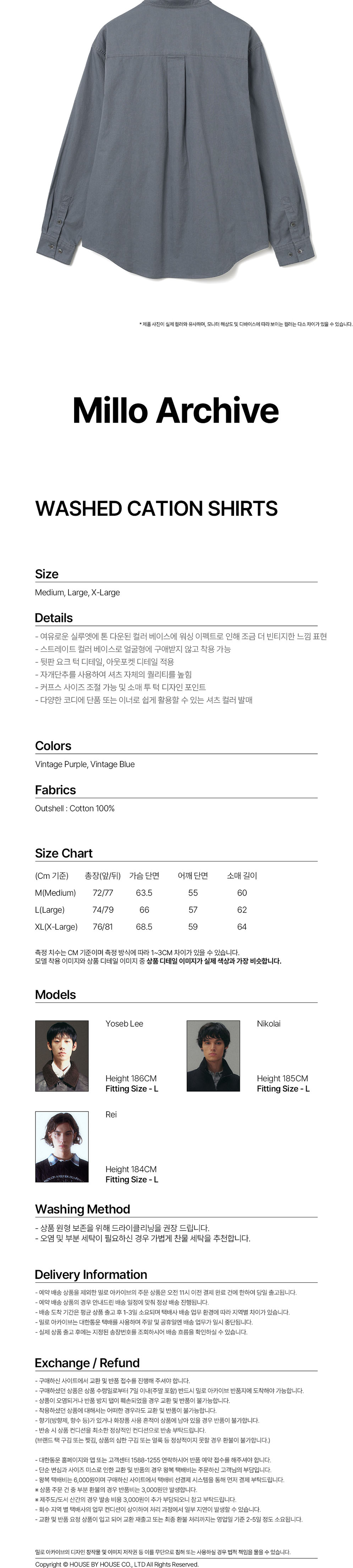 - 여유로운 실루엣에 톤 다운된 컬러 베이스에 워싱 이펙트로 인해 조금 더 빈티지한 느낌 표현 - 스트레이트 카라 베이스로 얼굴형에 구애받지 않고 착용 가능 - 뒷판 요크 턱 디테일, 아웃포켓 디테일 적용 - 자개단추를 사용하여 셔츠 자체의 퀄리티를 높힘 - 커프스 사이즈 조절 가능 및 소매 투 턱 디자인 포인트 - 다양한 코디에 단품 또는 이너로 쉽게 활용할 수 있는 셔츠 컬러 발매