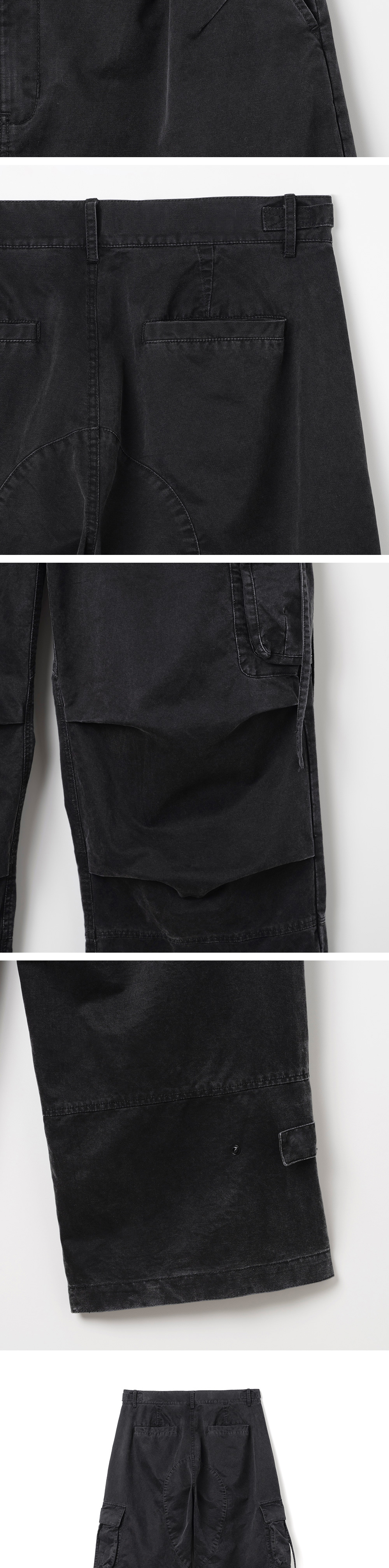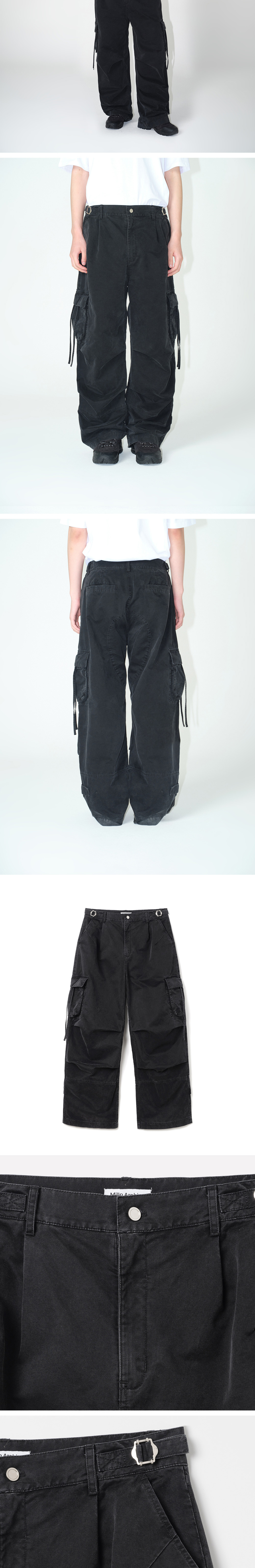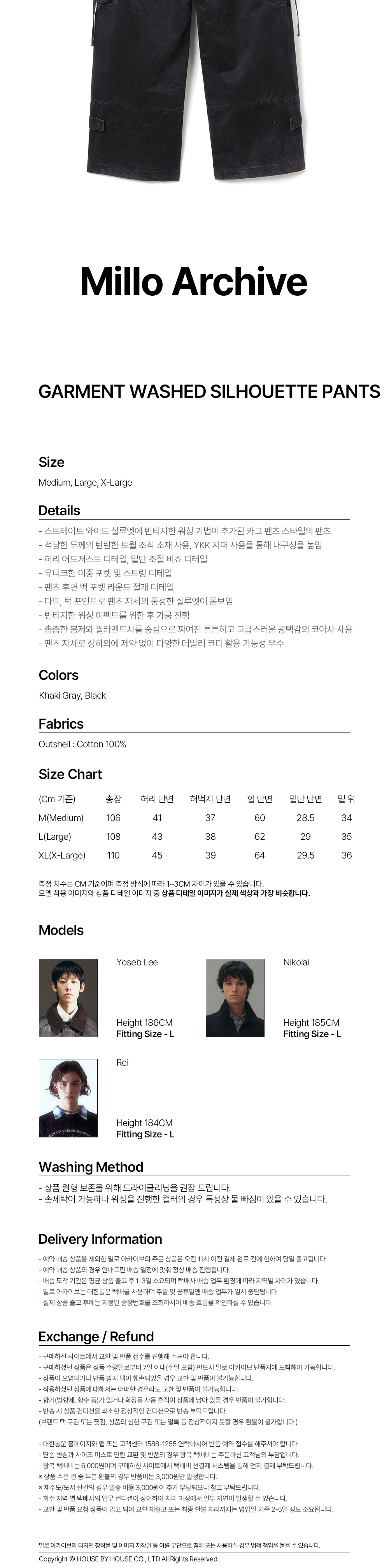 - 스트레이트 와이드 실루엣에 빈티지한 워싱 기법이 추가된 카고 팬츠 스타일의 팬츠 - 적당한 두께의 탄탄한 트윌 조직 소재 사용, YKK 지퍼 사용을 통해 내구성을 높임 - 허리 어드저스트 디테일, 밑단 조절 비죠 디테일 - 유니크한 이중 포켓 및 스트링 디테일 - 팬츠 후면 백 포켓 라운드 절개 디테일 - 다트, 턱 포인트로 팬츠 자체의 풍성한 실루엣이 돋보임 - 빈티지한 워싱 이펙트를 위한 후 가공 진행 - 촘촘한 봉제와 필라멘트사를 중심으로 짜여진 튼튼하고 고급스러운 광택감의 코아사 사용 - 팬츠 자체로 상하의에 제약 없이 다양한 데일리 코디 활용 가능성 우수
