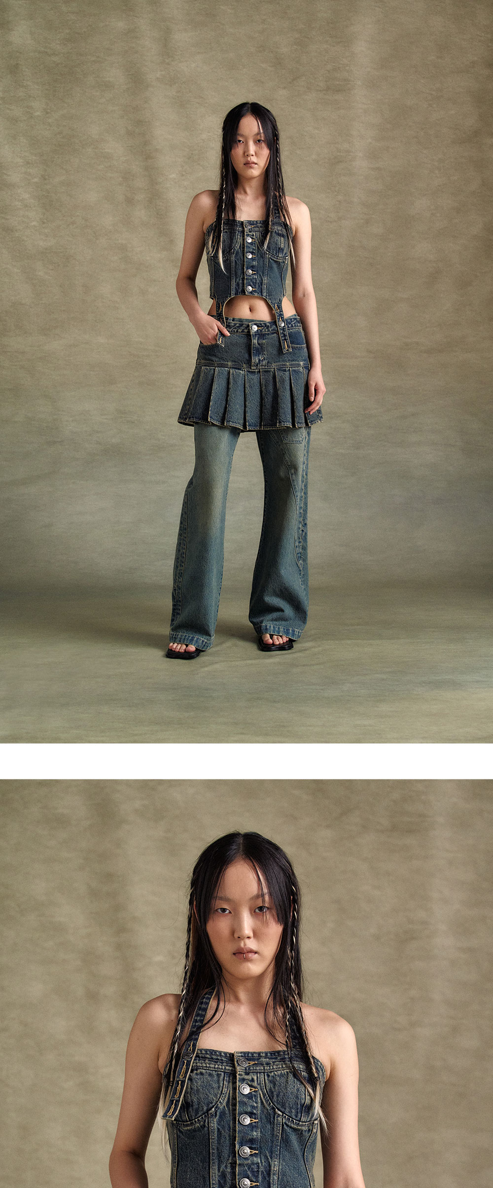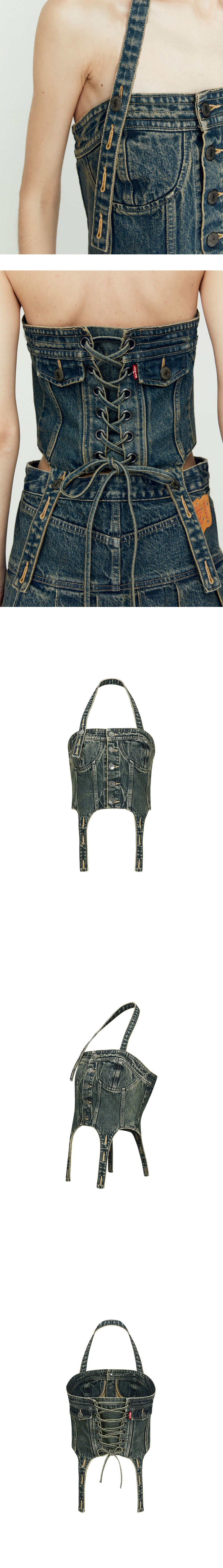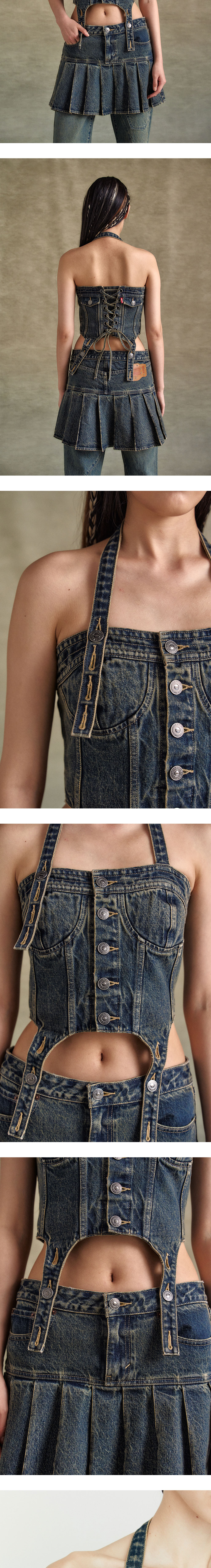 함께 착용할 수 있도록 디자인된 Denim Corset과 Pleated Skirt는 완벽한 매칭 세트입니다. 데님 코르셋은 홀터 톱 스트랩 디테일과 조절 가능한 버튼 홀, 플리츠 스커트와 연결할 수 있는 가터 디테일을 갖추고 있습니다. - LEVIS X ADSB DENIM CORSET / LEVI'S X ADSB PLEATED SKIRT - Denim Corset과 Pleated Skirt 셋업 - 데님 코르셋은 홀터 톱 스트랩 디테일과 조절 가능 - 코르셋 & 스커트와 연결할 수 있는 가터 디테일