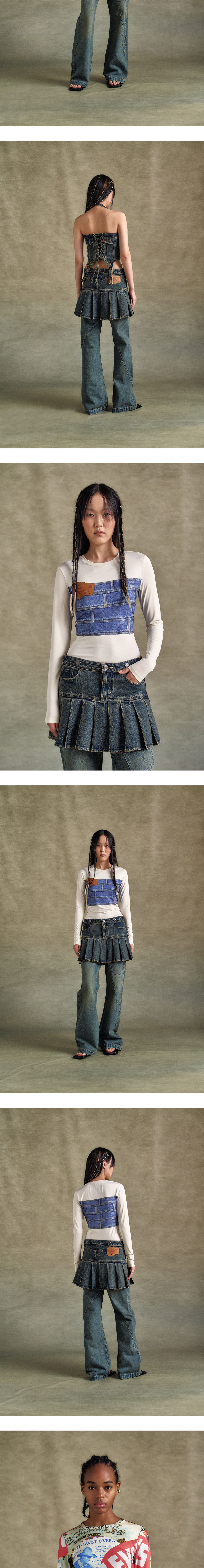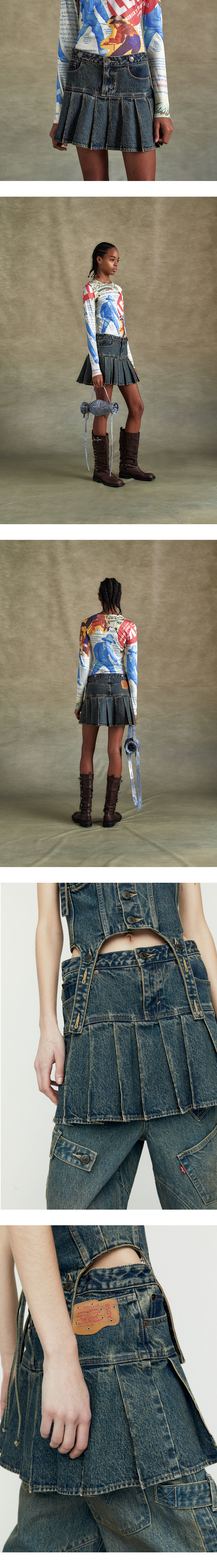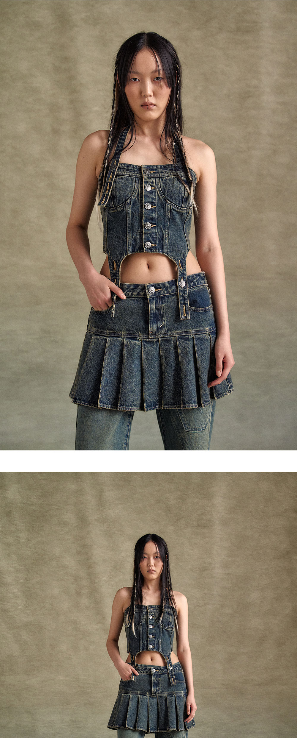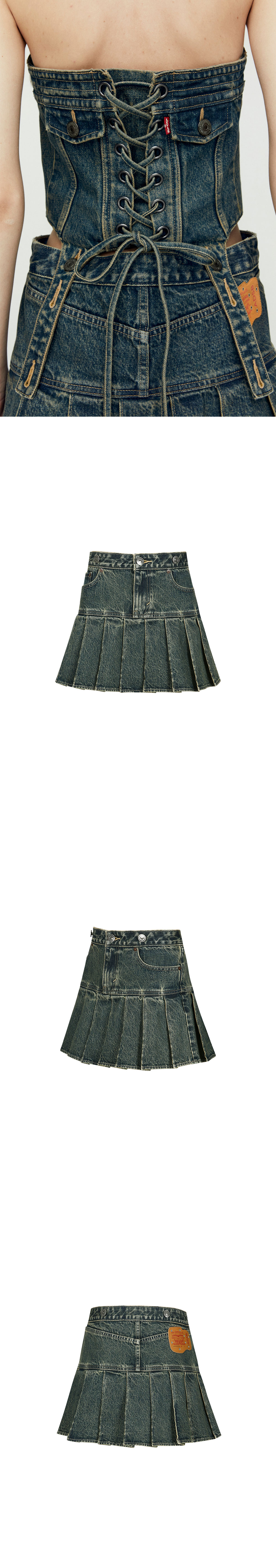 함께 착용할 수 있도록 디자인된 Denim Corset과 Pleated Skirt는 완벽한 매칭 세트입니다. 데님 코르셋은 홀터 톱 스트랩 디테일과 조절 가능한 버튼 홀, 플리츠 스커트와 연결할 수 있는 가터 디테일을 갖추고 있습니다. - LEVIS X ADSB DENIM CORSET / LEVI'S X ADSB PLEATED SKIRT - Denim Corset과 Pleated Skirt 셋업 - 데님 코르셋은 홀터 톱 스트랩 디테일과 조절 가능 - 코르셋 & 스커트와 연결할 수 있는 가터 디테일