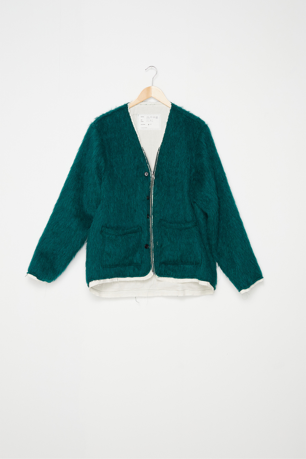 튀어나온 안감이 레이어링한 느낌을 주는 카미엘 포트젠스의 브이넥 가디건입니다. - 전면 지퍼 및 버튼 클로징 - 부드러운 면 소재의 안감 - 전면 2개의 패치 포켓 - 가장자리에 적용된 러프한 마감 디테일