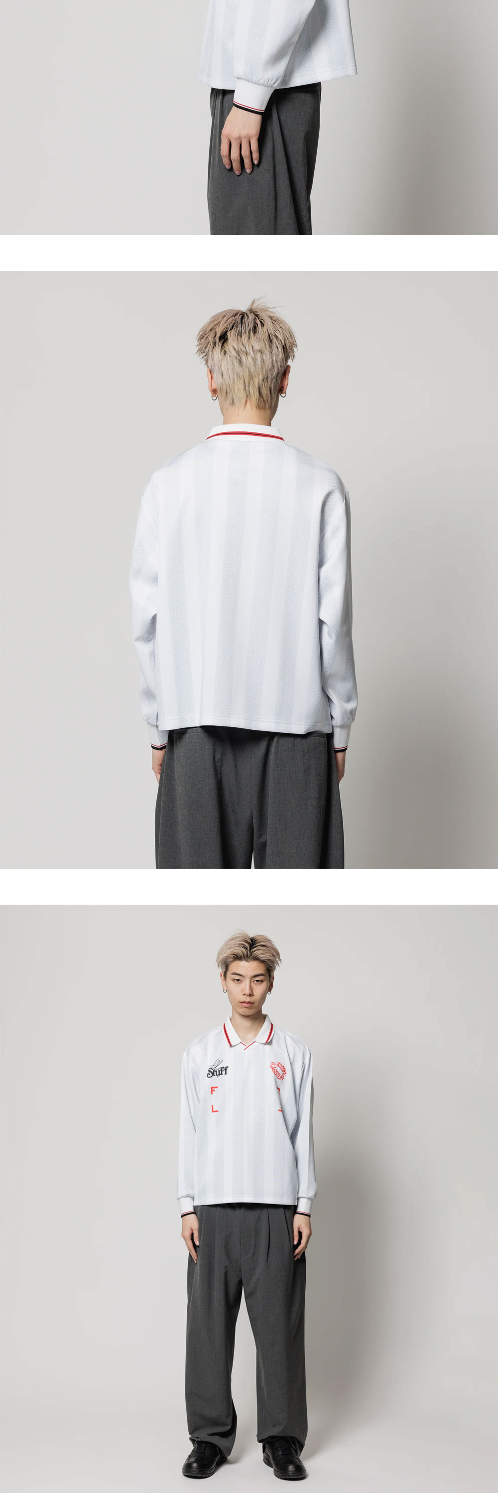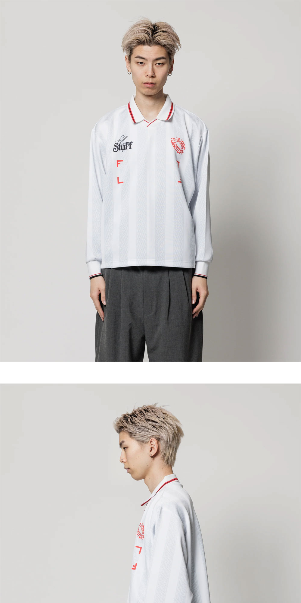 주름이 잘 안 지고 유니크한 게임 디자인의 Flagstuff의 게임 셔츠 롱 슬리브티 입니다. - 와이드 실루엣 - 탄력있고 주름이 잘 안지는 코튼 100% 소재 사용 - 오리지날 디자인 게임 셔츠 *모델 White color 착용