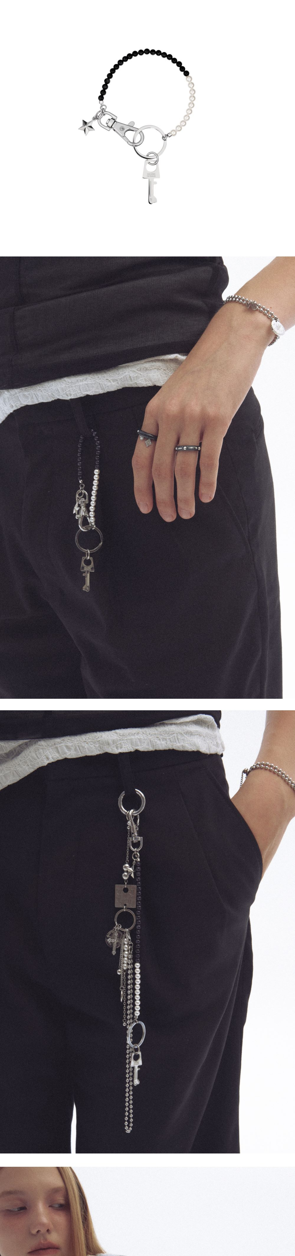 색감 대비가 뚜렷히 드러나는 키링입니다. 진주와 원석으로 구성되어 있으며, 다양한 모양의 펜던트들과 소재를 사용해 nff만의 무드를 더합니다.