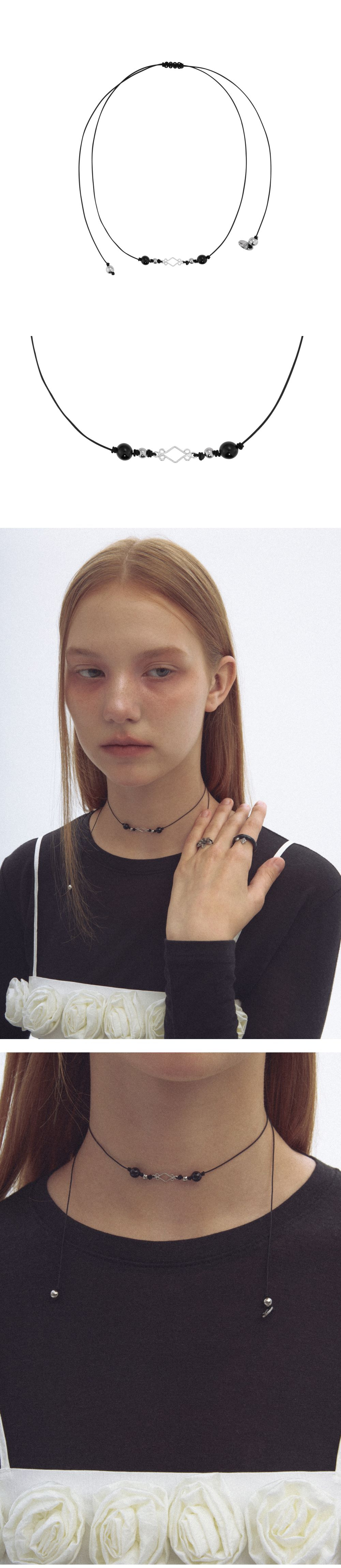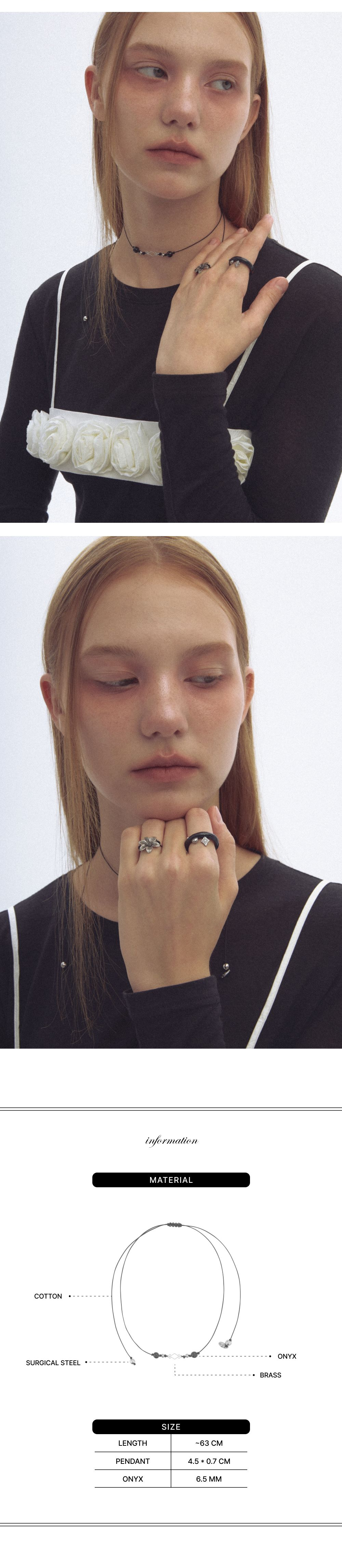 긴 나열의 펜던트들, 그리고 오닉스에 블랙 스트링을 더한 목걸이입니다. 실버 볼이 달린 끝 매듭을 활용해 길이조절이 가능하며 그에 따라 다양한 스타일링이 가능합니다.