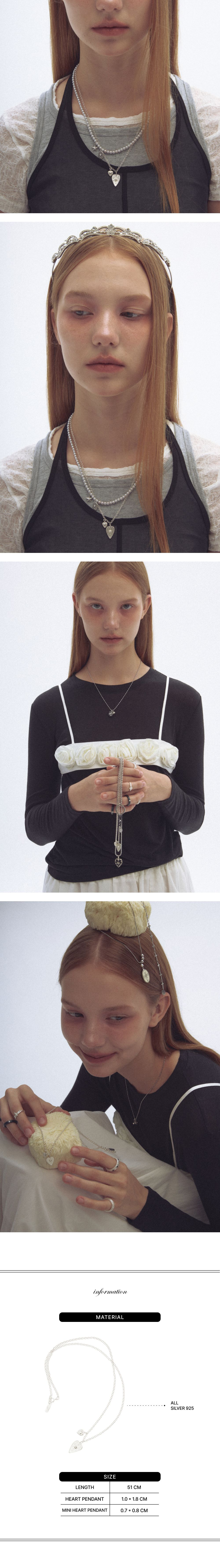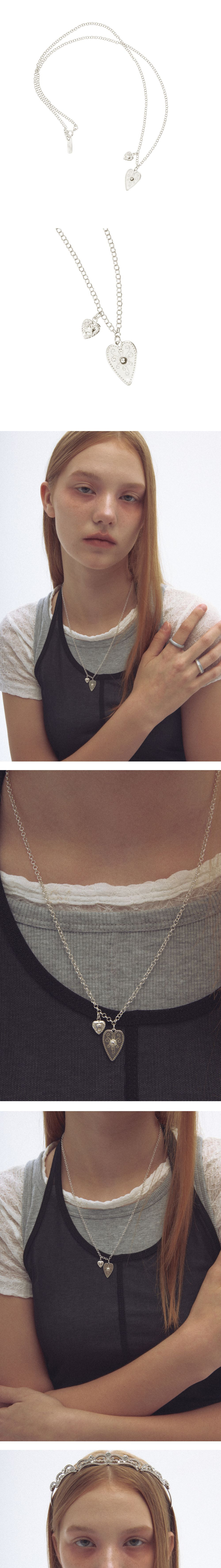 한 쌍을 이루는 하트 펜던트들이 돋보이는 목걸이입니다. 작은 펜던트들이 돋보이기 위해 얇은 실버체인을 사용했으며, 엔틱한 문양의 각인을 통해 silver 925제품에서도 nff만의 무드를 담아내고자 합니다. * 주의사항 - 착용할 때는 향수, 크림 및 다른 화학 물질과의 접촉은 피해주세요. 씻거나 로션을 바르기 전에는 반드시 제거해야 합니다. - 착용하지 않을 때는 공기와의 접촉을 최소화할 수 있는 지퍼백이나 상자에 보관하는 것이 좋습니다. - 세척 시 부드러운 천이나 전용 세척제로 부드럽게 닦아주세요.