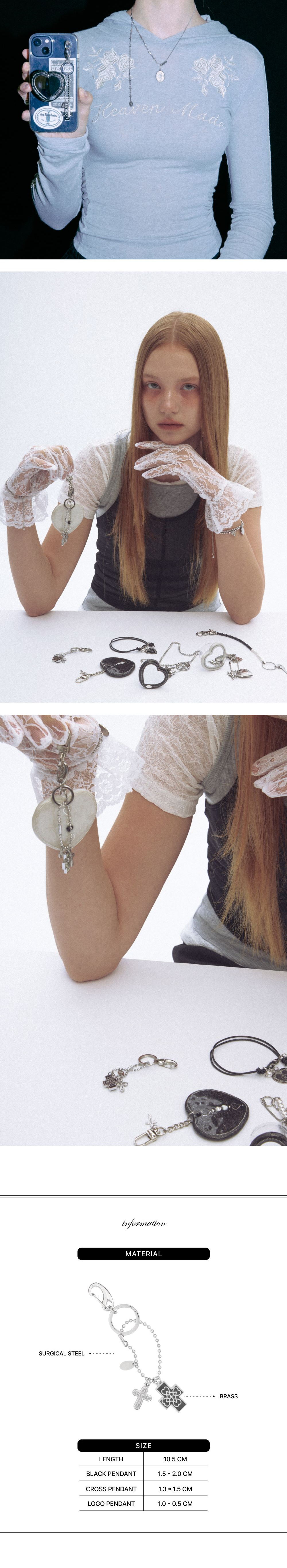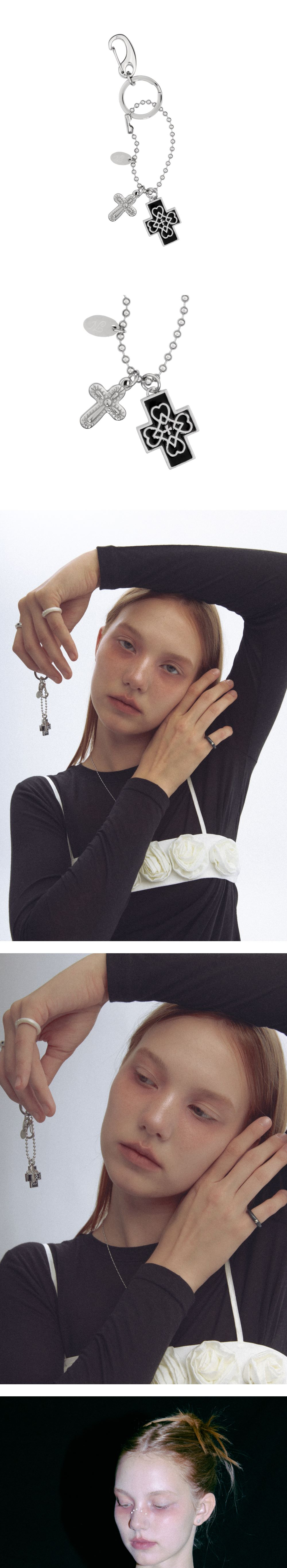 한 쌍의 십자가 펜던트의 조합이 돋보이는 키링입니다. 다양한 쉐입으로 이루어진 문양들과 음각들을 통해 nff의 브랜드 무드를 전달하고자 하며, 의류, 가방 등 다양한 곳에 조화롭게 매칭할 수 있는 디자인입니다.