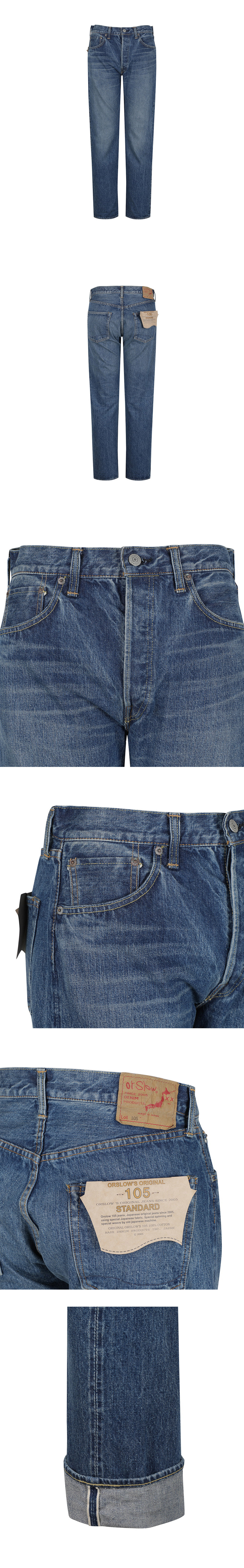 오어슬로우를 대표하는 모델이자, 베스트셀러인 오어슬로우의 105 데님입니다. - 레귤러 핏 - 105 스탠다드 버전 베이스 - 워싱으로 경년 변화 구현 - 100% 일본산 데님 코튼 소재 - 버튼 플라이