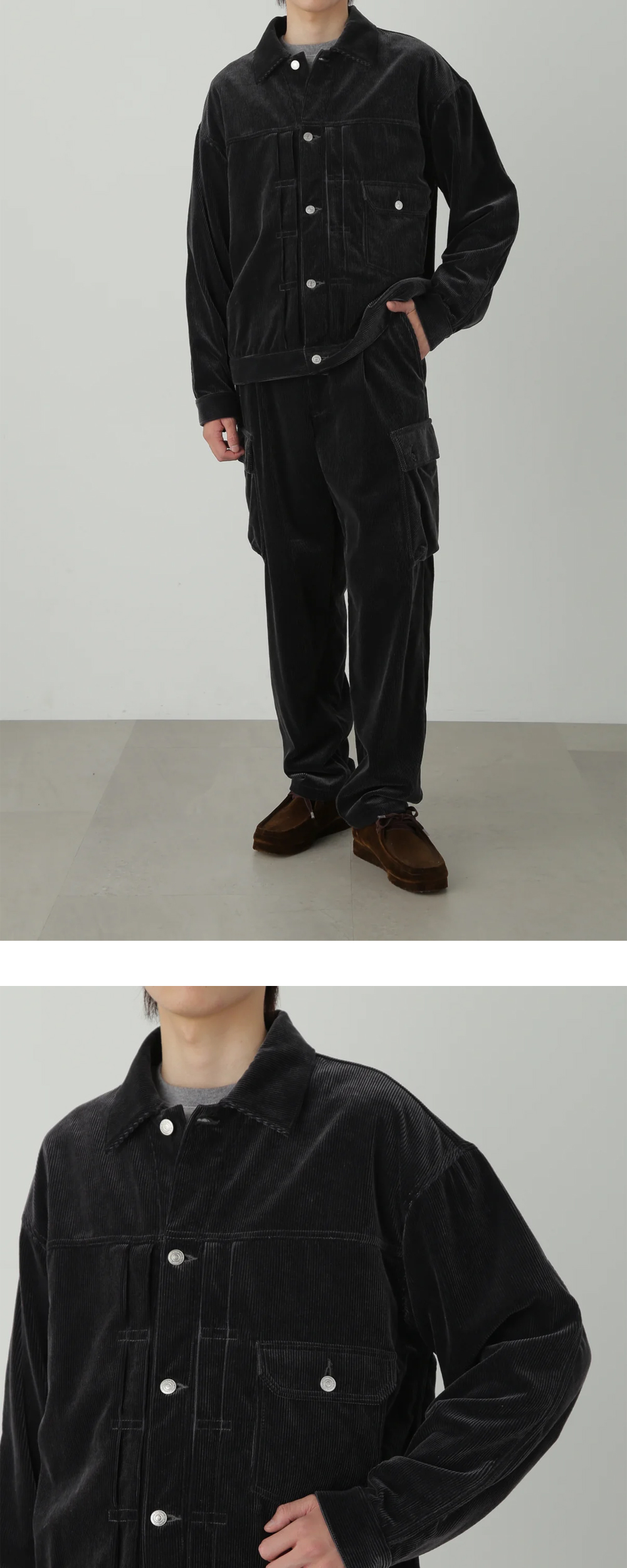 넉넉한 실루엣과 코듀로이 소재가 우아한 느낌을 주는 세븐바이세븐의 퍼스트 타입 자켓입니다. - 리바이스 타입 1 자켓을 재해석한 디자인 - 백 요크 및 전면 안감 디테일 - 부드럽고 광택 있는 소재 - 볼륨감 있으면서도 균형 잡힌 실루엣 - 코듀로이 와이드 팬츠와 셋업으로 활용 가능 * 모델샷은 동일 모델의 블랙 컬러입니다.
