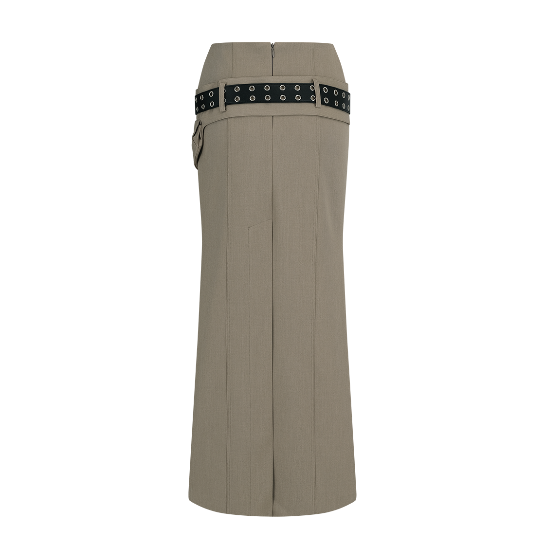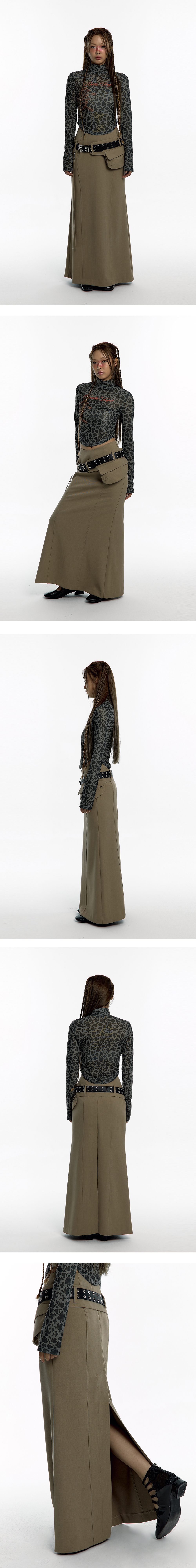 ***9/30 배송되는 프리오더 상품입니다*** 로고각인의 레더벨트와 스커트 구성의 세트상품입니다. 뒷 슬릿으로 걸음이 편안하고 허리선에 라인을 주어 더욱 포인트가 됩니다.