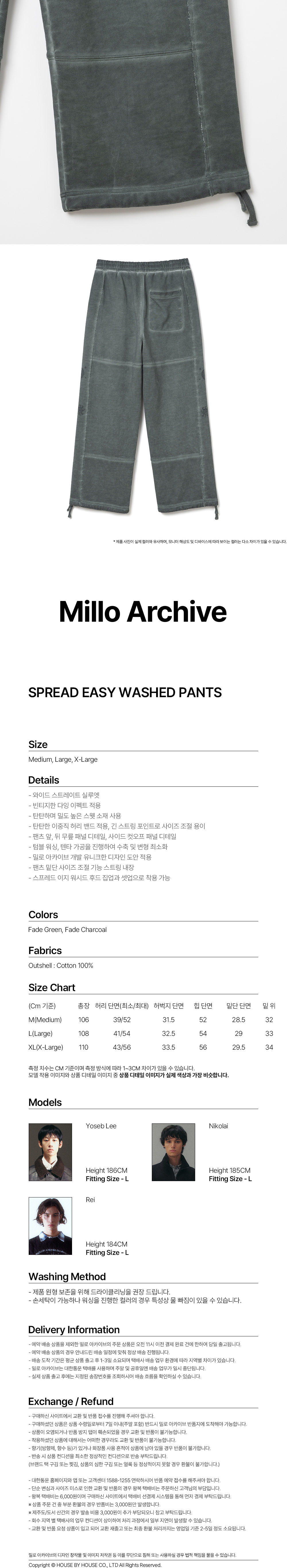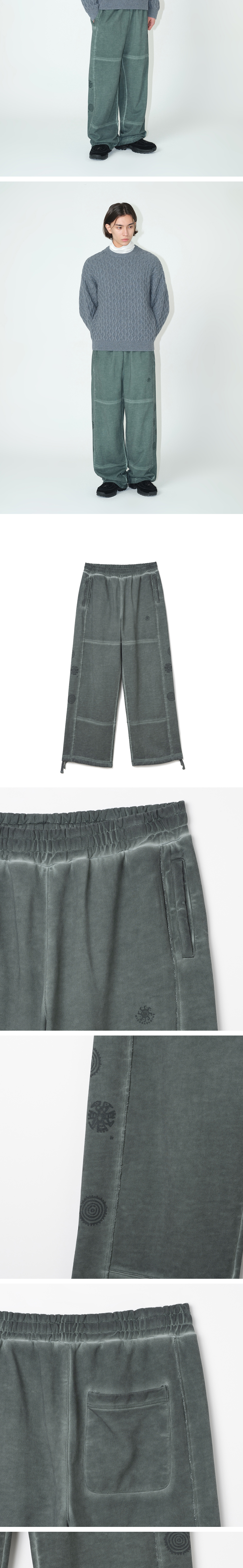 - 와이드 스트레이트 실루엣 - 빈티지한 다잉 이펙트 적용 - 탄탄하며 밀도 높은 스웻 소재 사용 - 탄탄한 이중직 허리 밴드 적용, 긴 스트링 포인트로 사이즈 조절 용이 - 팬츠 앞, 뒤 무릎 패널 디테일, 사이드 컷오프 패널 디테일 - 텀블 워싱, 텐타 가공을 진행하여 수축 및 변형 최소화 - 밀로 아카이브 개발 유니크한 디자인 도안 적용 - 팬츠 밑단 사이즈 조절 기능 스트링 내장 - 스프레드 이지 워시드 후드 집업과 셋업으로 착용 가능