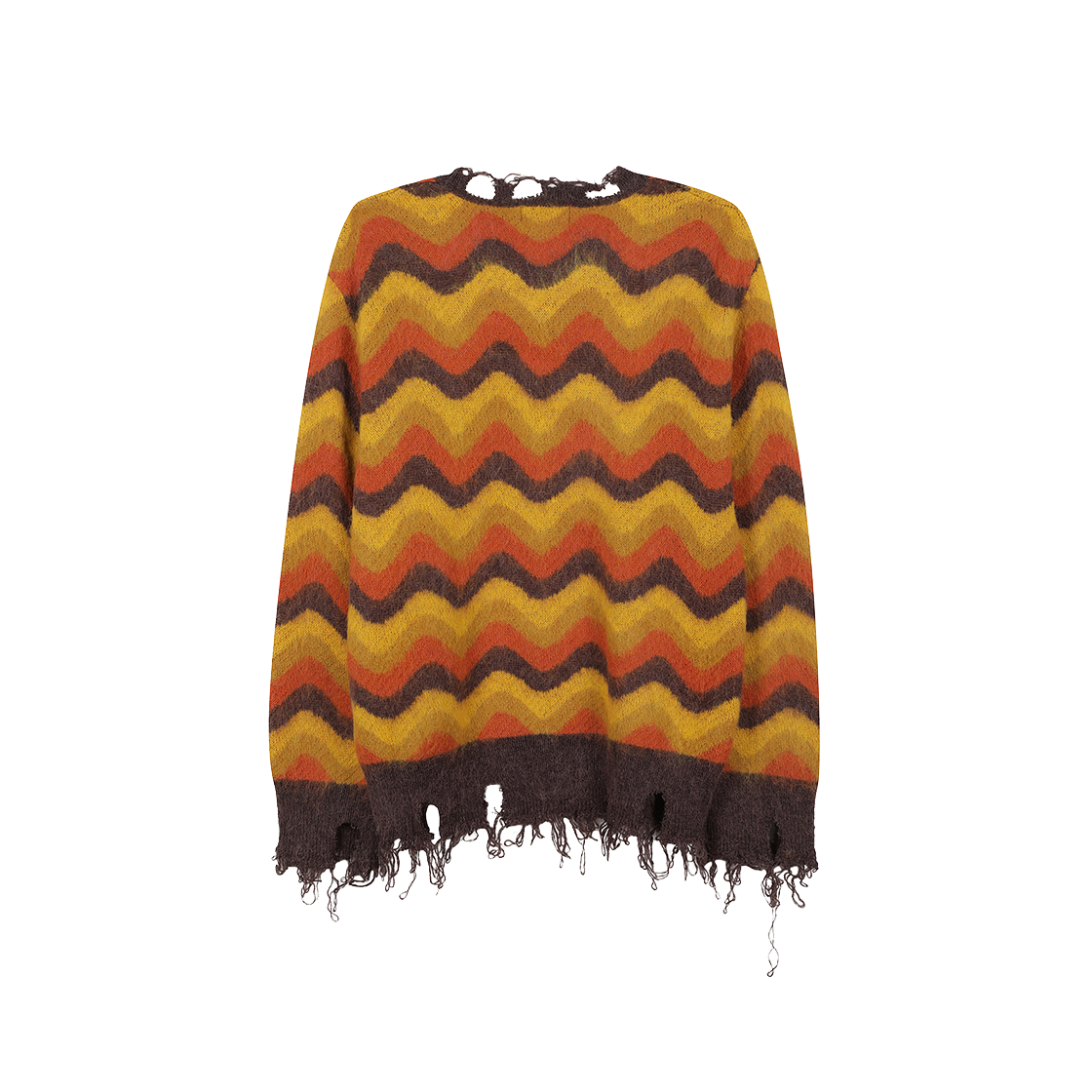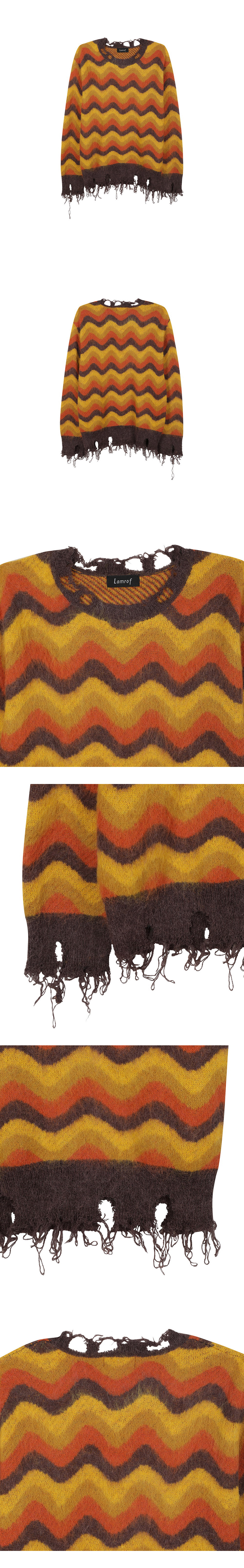 미드센츄리 양식에서 영감을 받은 컬러와 패턴이 매력적인 람로프의 모헤어 니트입니다. - 모헤어 혼방 소재로 부드러운 촉감 - 뛰어난 보온성 - 칼라, 소매, 밑단에 적용된 과감한 데미지 디테일
