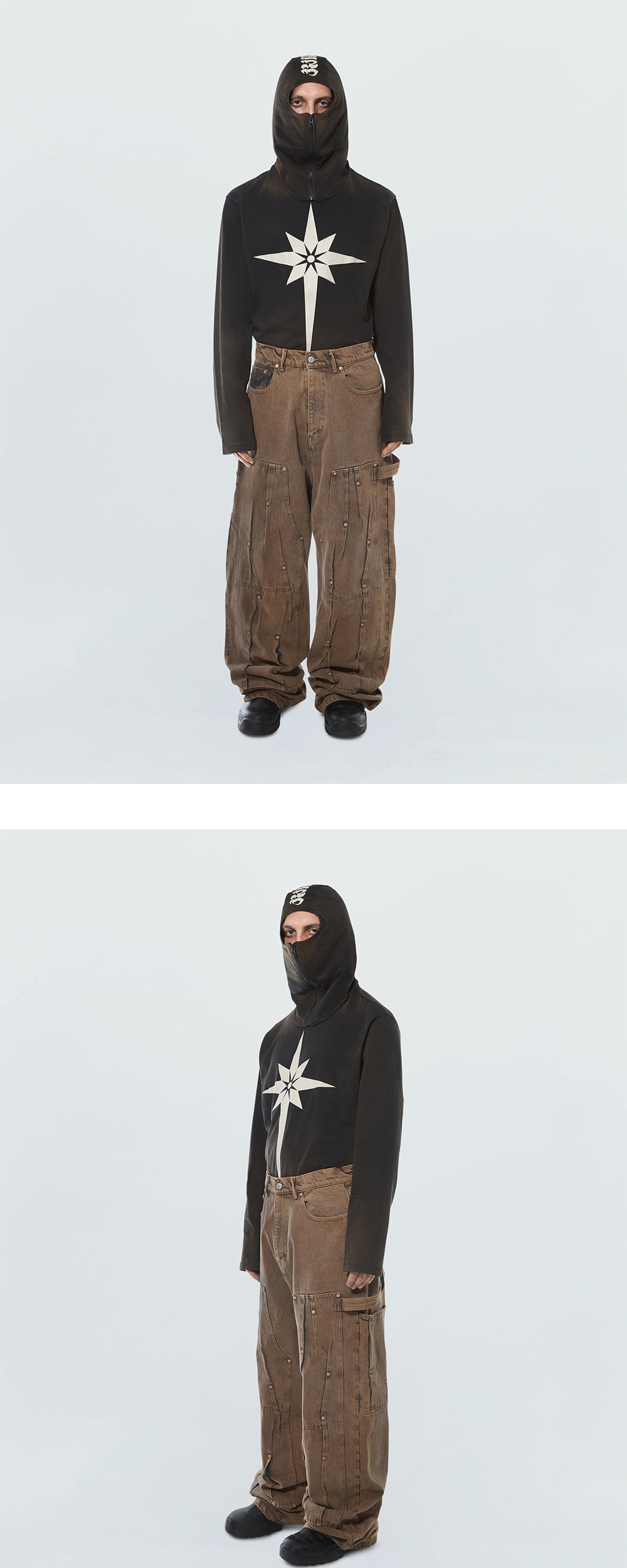 녹슨 듯한 색감의 카펜터 팬츠에 리벳 디테일을 더한 쿠시코크의 멀티 리벳 데님입니다. - 미드라이즈 디자인 - 전면 패널 및 리벳 디테일 - 카펜터 팬츠 스타일의 해머루프 및 패치 포켓 디테일 - 한 번 꼬인 형태의 벨트루프 - 지퍼 플라이 - 후면 로고 패치
