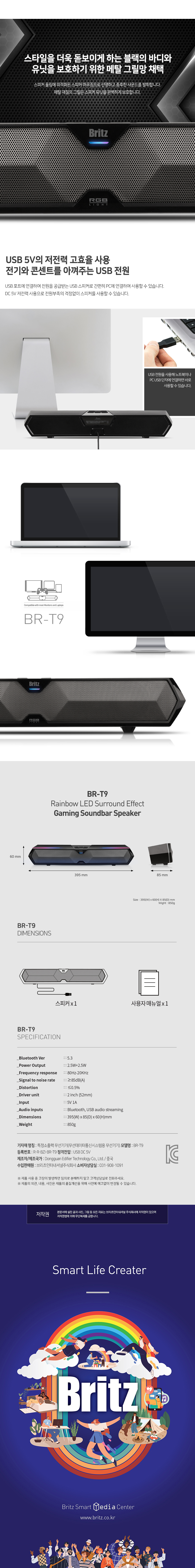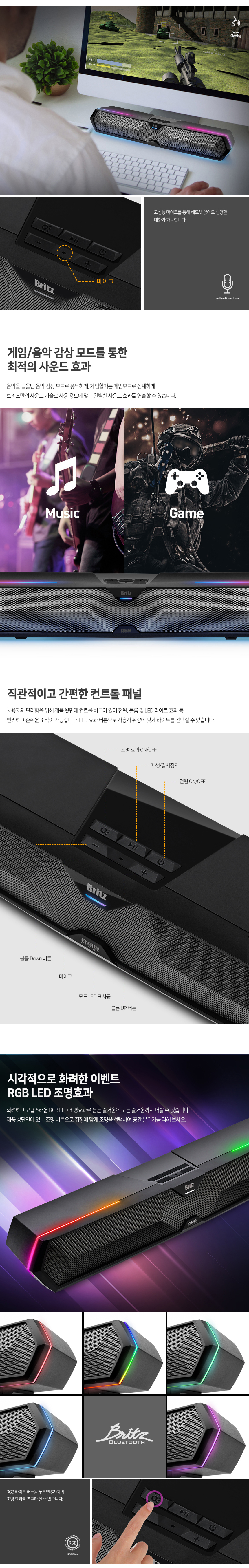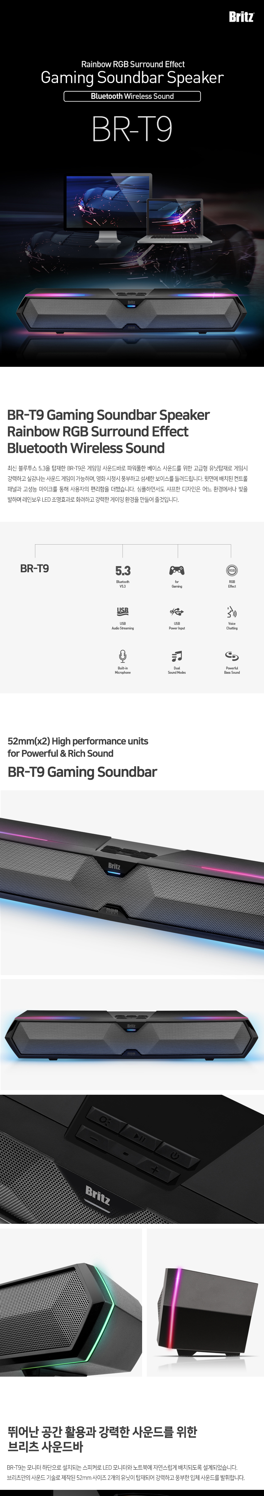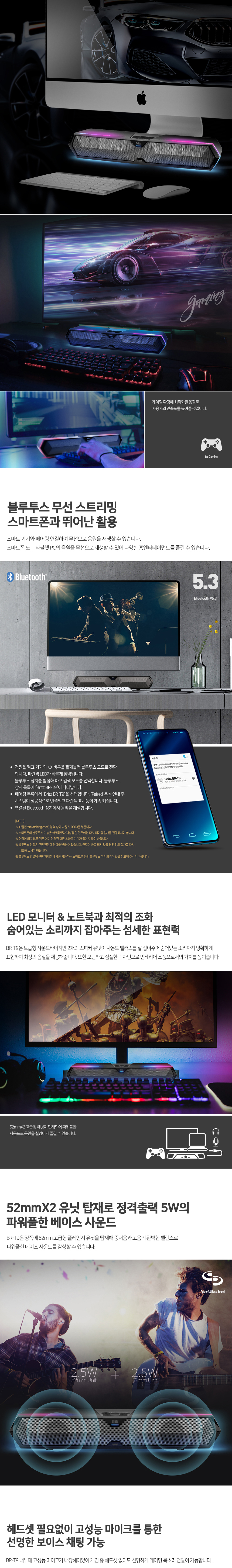 브리츠 BR-T9 블루투스 게이밍 사운드바 스피커 블랙