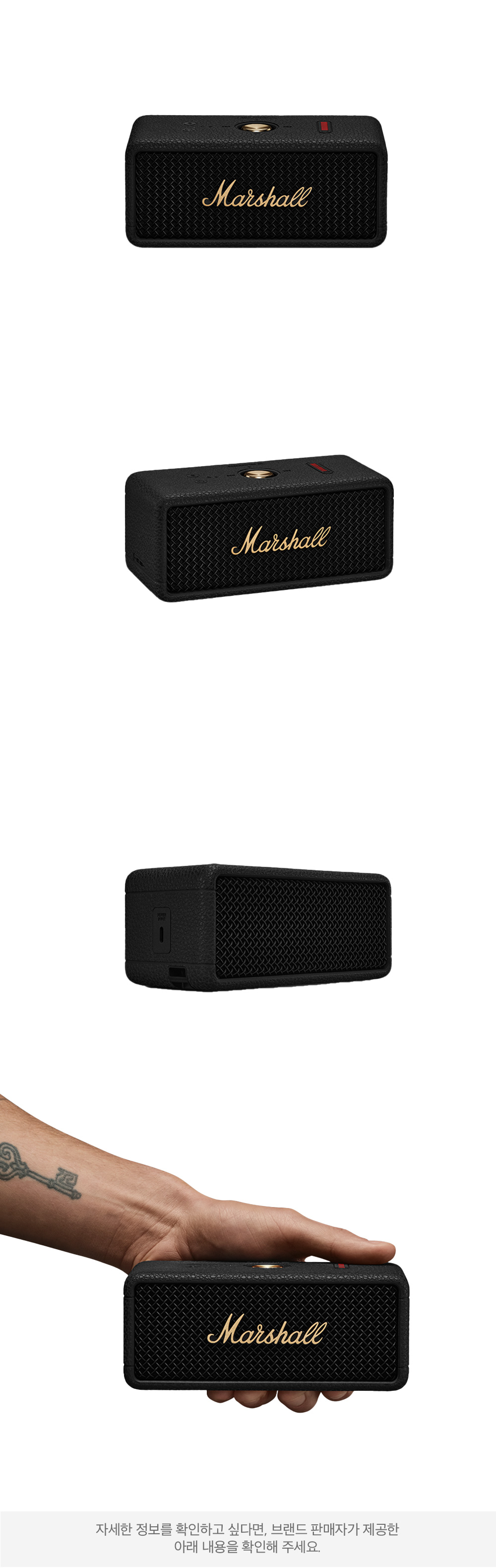 Emberton III는 Marshall의 생생한 프리미엄 사운드를 제공하는 휴대용 스피커이며 모든 지점이 스위트 스팟인 독특한 다방향 입체 사운드로 수준 높은 360° 사운드를 경험 할 수 있고 견고한 내구성과 최고 수준의 방진 및 방수 등급(IP67)로 캠핑, 여행, 운동 등의 야외 활동 시 활용도가 높습니다.