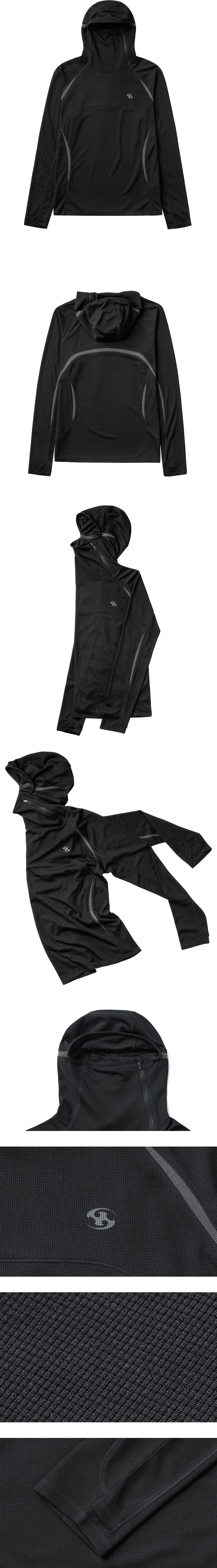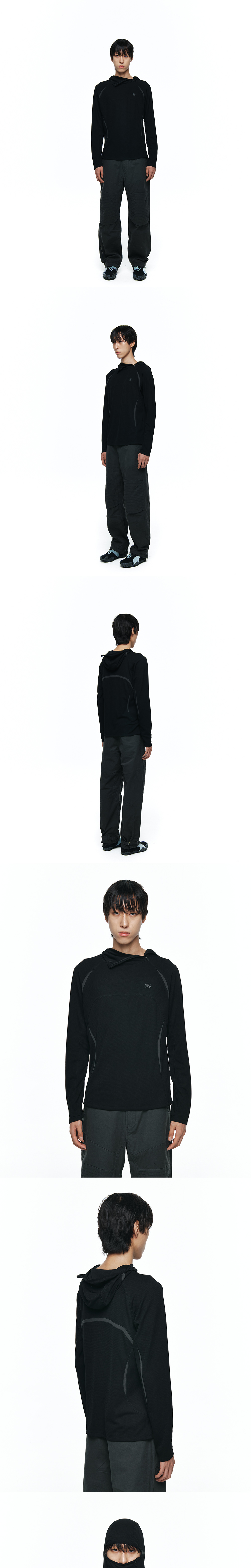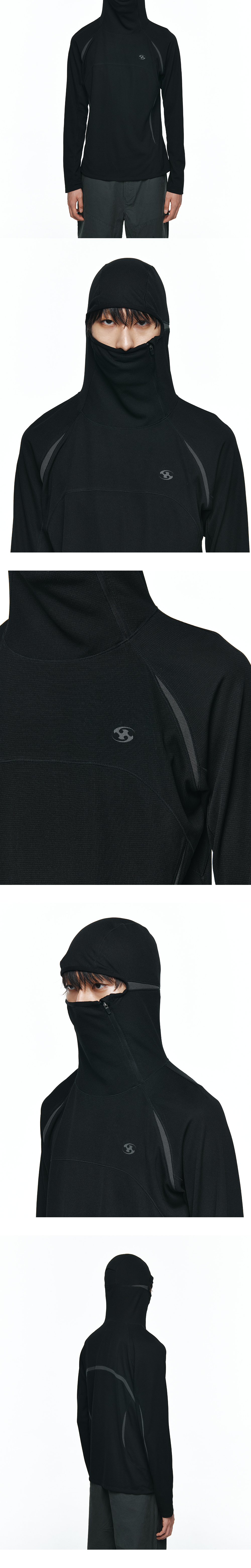 바라클라바 형태의 슬림핏 후디 롱슬리브 와플 조직 원단 절개 패널 컬러 배색 소매 핑거홀 디테일