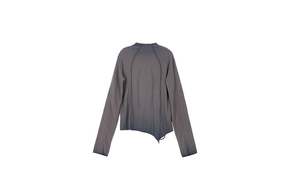 비대칭 스타일 빈티디 가먼트 다잉 롱슬리브 티셔츠 비대칭 밑단 핀치와 랍바 디테일 래글런 소매 전면 상단 금속 부자재 디테일 Asymmetric style Vintage clothing dyeing long sleeve t-shirt Asymmetric the hem Pinch and binding Detail Raglan sleeve Metal subsidiary material details in the front