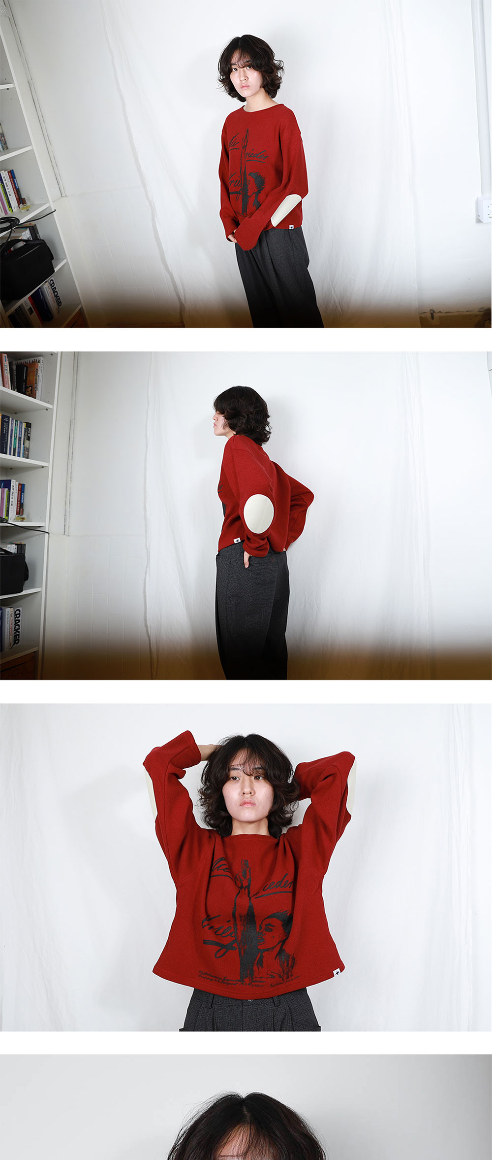 /24FW UMWEG/ Never Again War Elbow Patch Boat Neck Long Sleeve Knit Red 다시는 전쟁 그만 엘보우 패치 보트넥 롱슬리브 니트 레드 Käthe Kollwitz (1867-1945), Plakat »Nie wieder Krieg«, 1924 보관과 관리가 까다로운 니트의 단점을 보완한, 아늑하고 포근한 사카리바 원단을 사용했습니다. 사카리바 원단은 복원력과 형태안정성이 뛰어날 뿐만 아니라, 따뜻하고 통기성이 좋아 쾌적한 착용감을 자랑합니다. 보트넥 넥라인으로 디자인하여 착용시 목이 갑갑한 느낌을 없애고 활동성을 높였습니다. 이에 더해 소가죽 패치를 팔꿈치에 덧대어 실용성을 더했습니다. 전체적으로 편안하고 여유로운 실루엣으로 디자인했습니다. 이번 시즌 주제인 우회로Umweg를 표현하는 가장 강력한 그래픽들을 담고 있습니다.