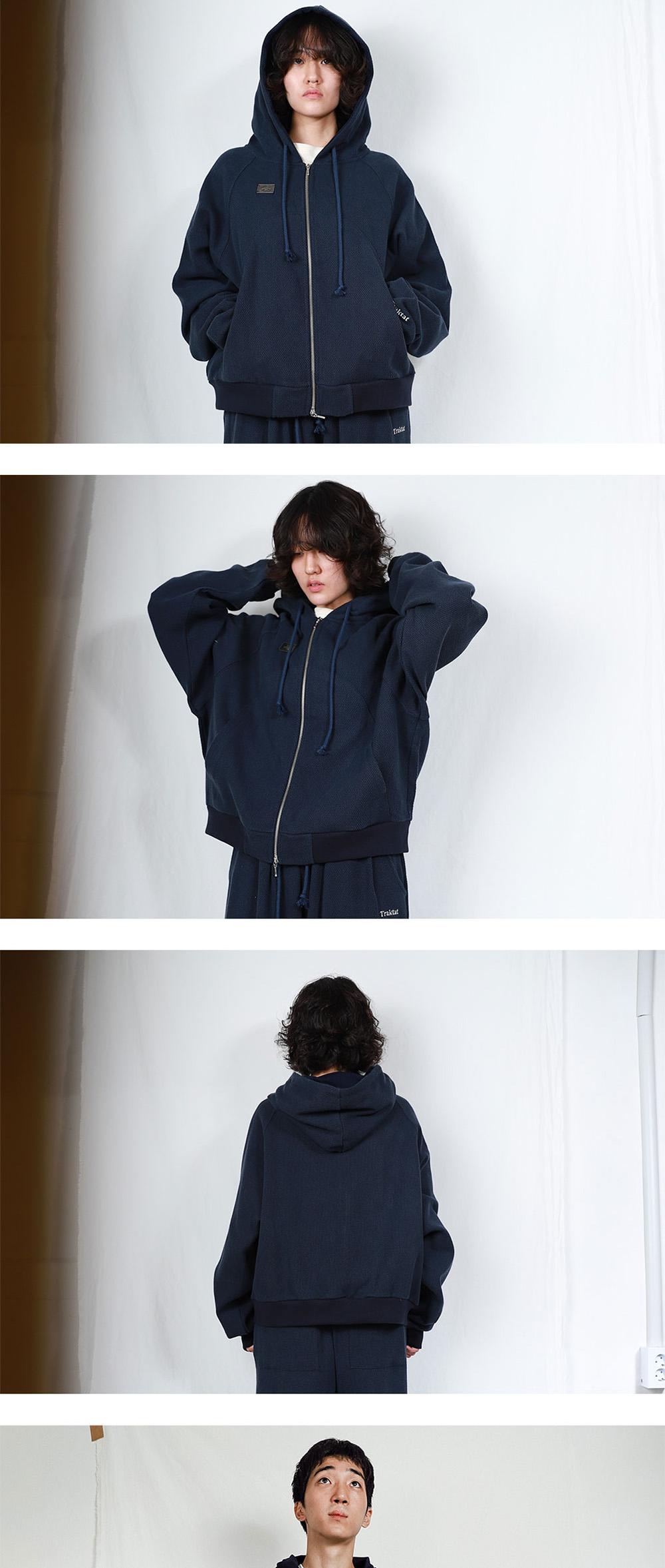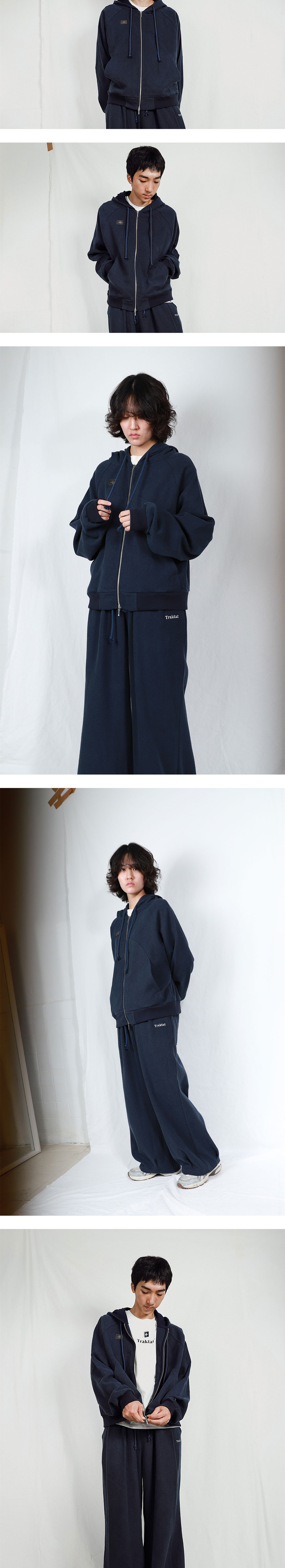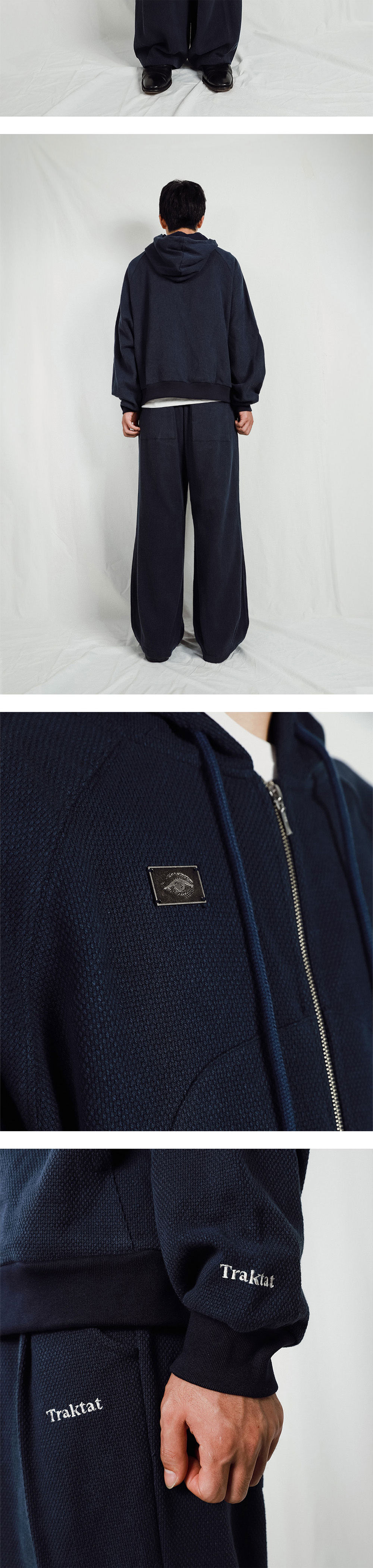 전면부에 구현된 '갓길'은 굽은 우회로Umweg의 형태로 디자인되었습니다. 주머니에서 시작되어 가슴을 거쳐 다시 주머니로 돌아오는 굽은 길은, 착용자의 자유롭고 실천적인 '손'을 매개로 합니다. 착용자가 주머니에 손을 넣고, 활동하는 일상의 모든 우연한 순간순간이 의지적이며 정신적인 행위로서 발견되기를 희망합니다. Detail/상세 - Cotton 100% Single-Weave Sashiko fabric - 오버사이즈 핏 - 굽은 갓길(Shoulder)을 표현한 전면부 절개 디테일 - Traktat Eye Logo 펜던트 디테일 - 손목 시그니쳐 포인트 자수 : 특수 실을 사용해 개체마다 색 배합이 조금씩 다릅니다. - 선 블리치 된 sun bleached 끈 사용 : 부자재 끈은 빈티지한 무드를 위해 썬블리치sun bleach된 것을 사용해 발색이 다소 일정하지 않을 수 있습니다. 이는 썬블리치 기법의 특징입니다. - 트락타트 오리지널 탭 - Ex-Libris 케어라벨