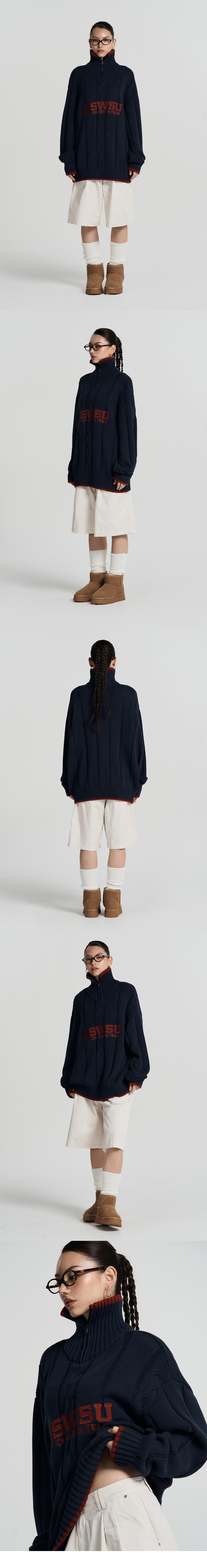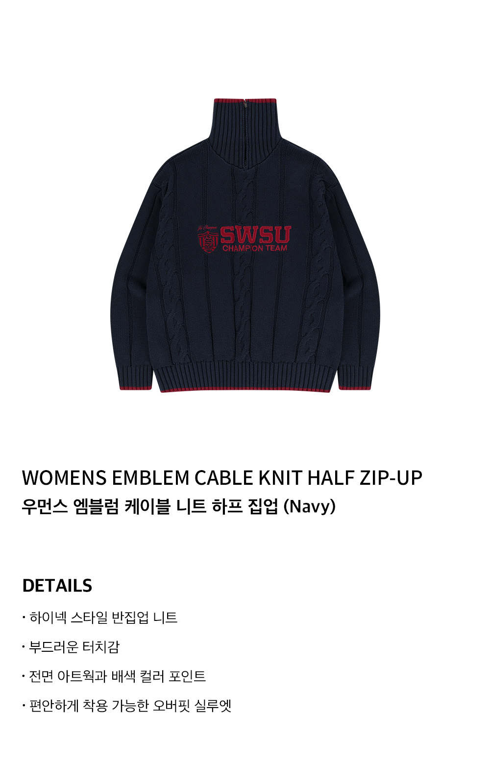 에이치덱스 우먼스 엠블럼 케이블 니트 하프 집업 네이비