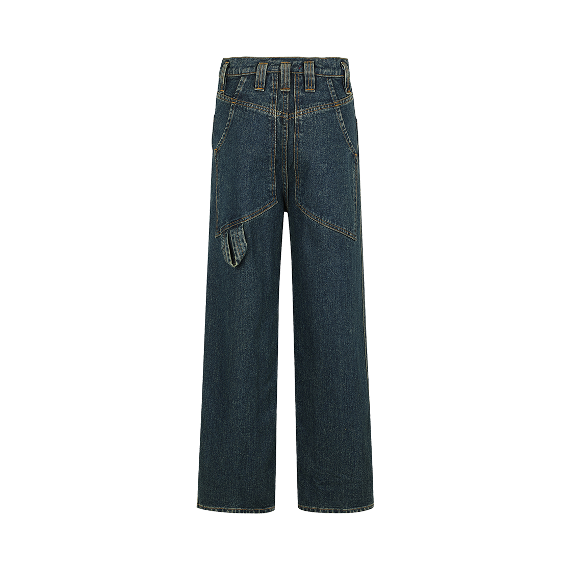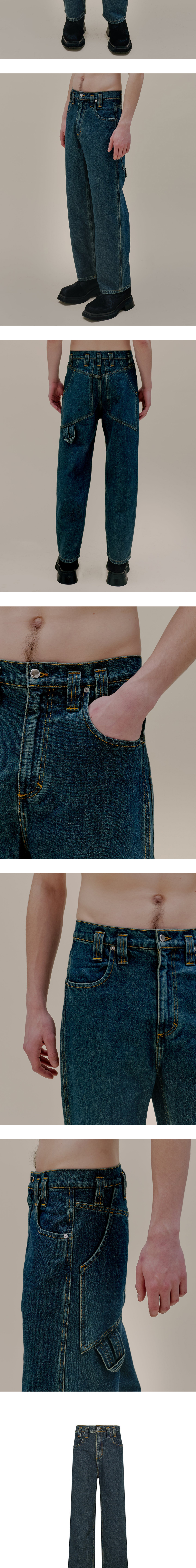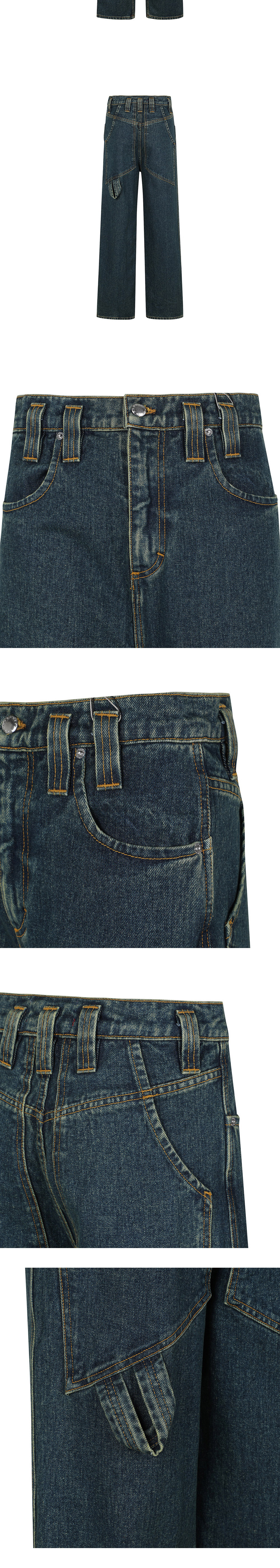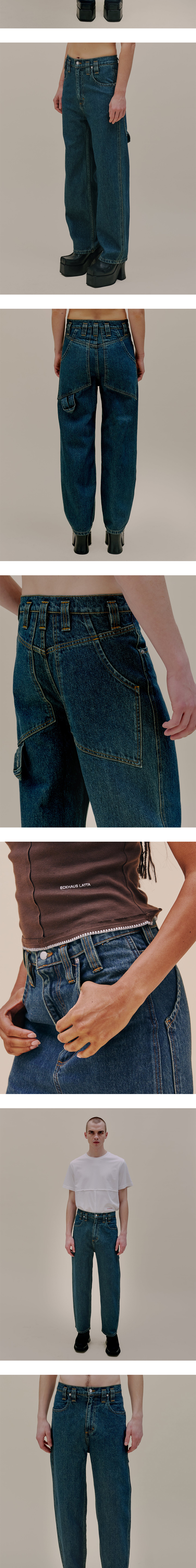 백 포켓과 부자재에서 브랜드 특유의 디테일이 묻어난 에크하우스 라타의 배기 진입니다. - 바이오 워싱 및 인디고 오버다잉 - 로고가 각인된 니켈 부자재 - 골드 컬러 스티치 디테일 - 과장된 크기의 벨트 루프 - 백 포켓에 적용된 해머 루프 디테일