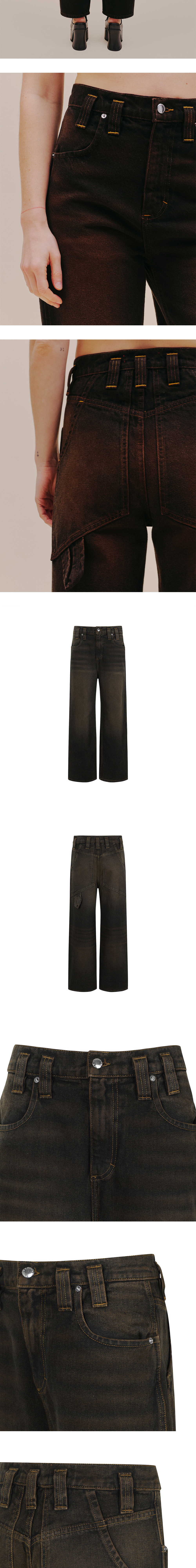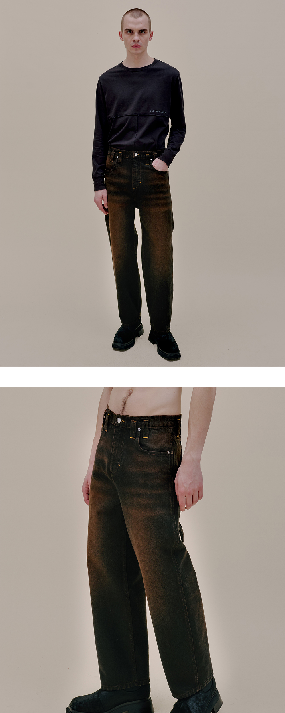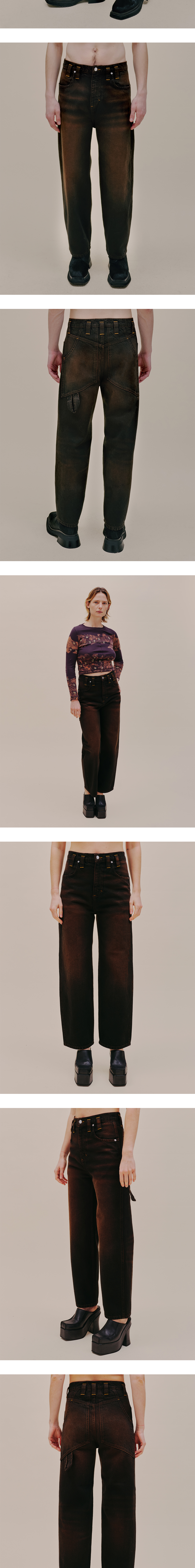 백 포켓과 부자재에서 브랜드 특유의 디테일이 묻어난 에크하우스 라타의 배기 진입니다. - 시그니처인 배기 진에 데미지를 입힌 디자인 - 워싱 및 디스트레스 가공 - 로고가 각인된 니켈 부자재 - 골드 컬러 스티치 디테일 - 과장된 크기의 벨트 루프 - 백 포켓에 적용된 해머 루프 디테일