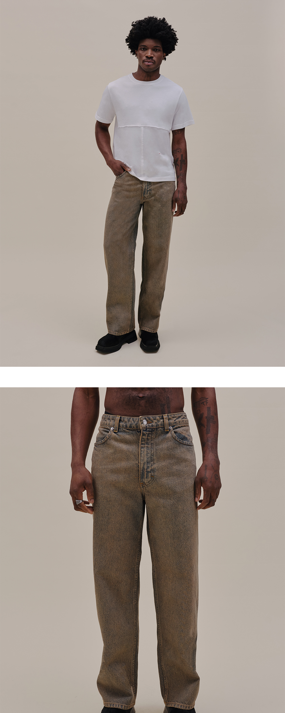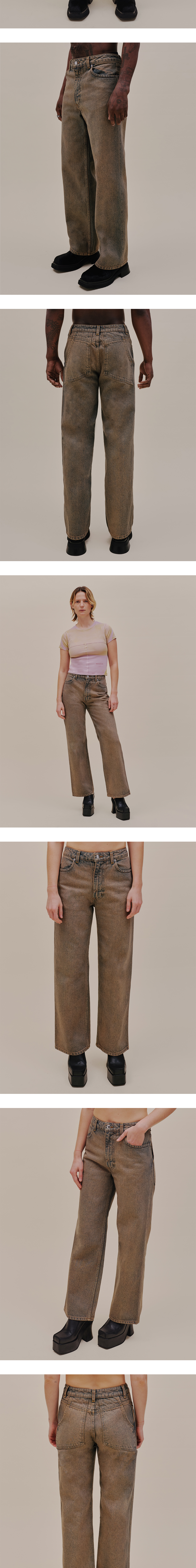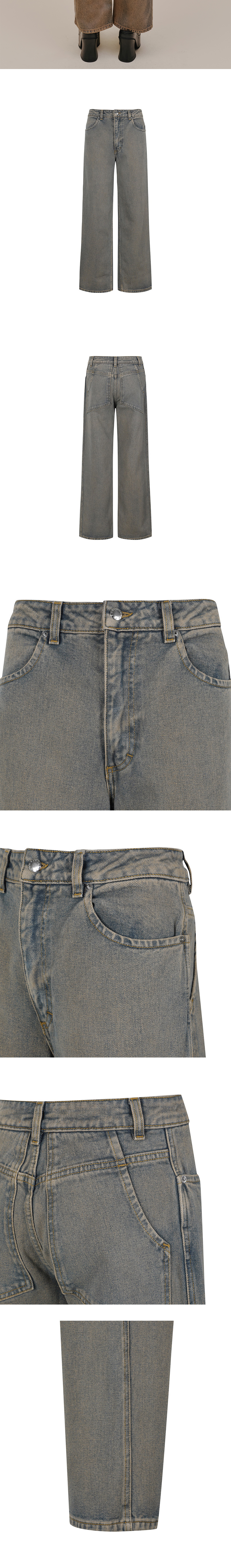과장된 길이와 실루엣이 인상적인 에크하우스 라타의 와이드 레그 진입니다. - 부드러운 헤비웨이트 데님 소재 - 로고가 각인된 니켈 부자재 - 과장된 크기의 벨트 루프